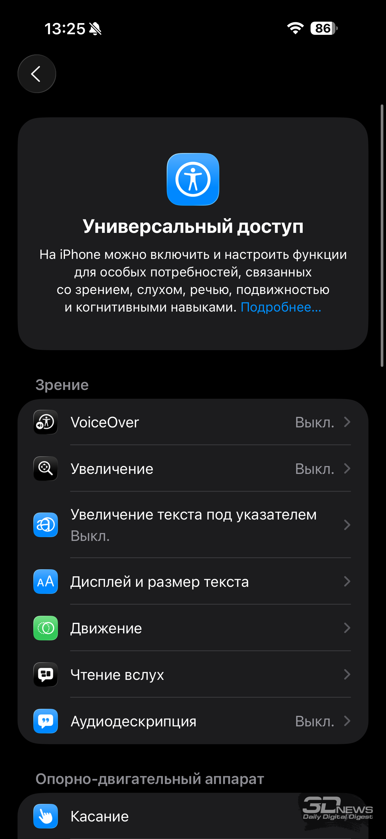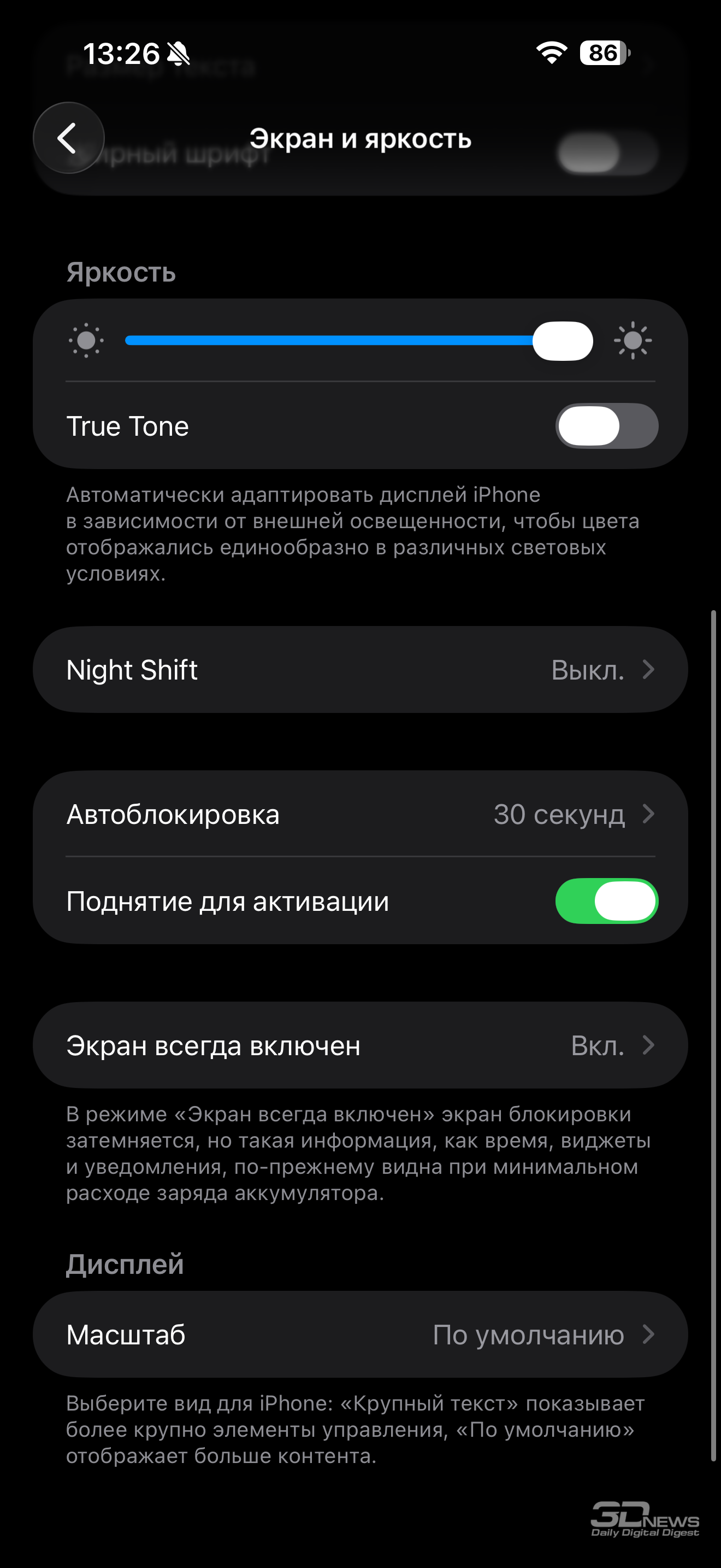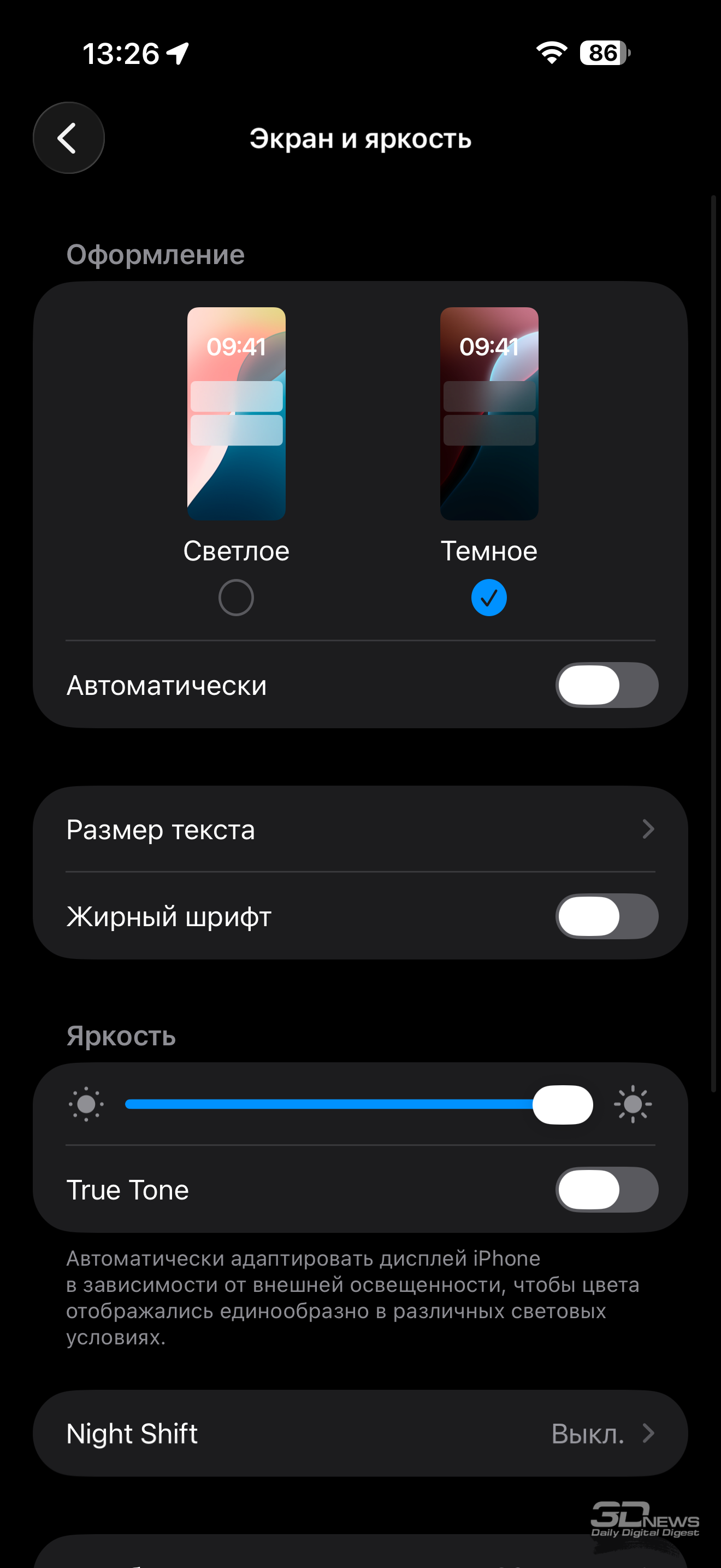 Глобально настройки дисплея на iOS 26 не поменялись: вручную настроить цветопередачу нельзя, можно лишь включить/выключить режим автоматической подстройки цветов под внешнее освещение True Tone, выбрать светлую или темную тему оболочки, активировать ночной режим и «поиграть со шрифтами». Расширились возможности настройки отображения информации на заблокированном дисплее (Always-On Display), но это не совсем касается именно настроек.