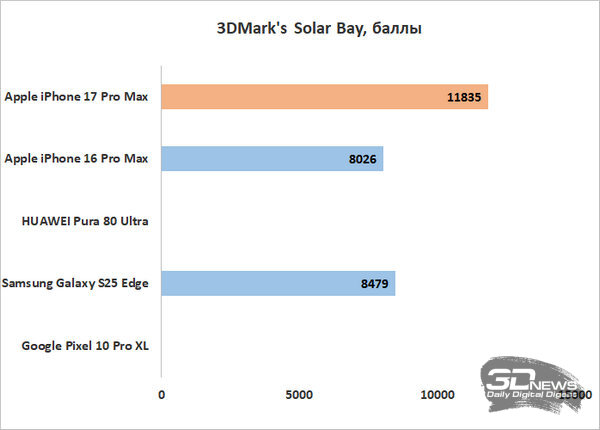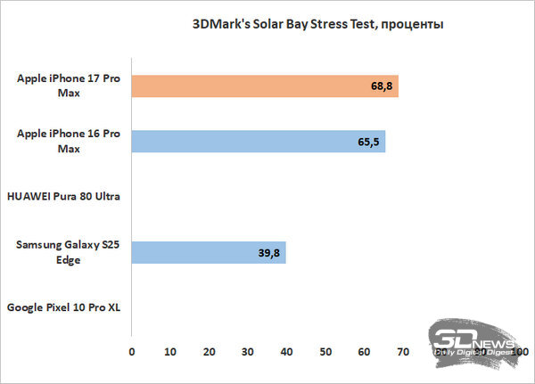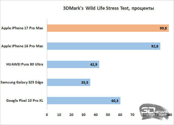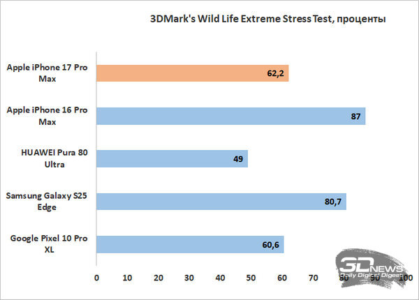При этом по троттлингу и нагреву дела у iPhone 17 Pro Max обстоят нормально, но не блестяще. До перегрева при любой нагрузке смартфон у меня не дошел, но нагревался при этом очень заметно, а в ресурсных тестах показал уровень троттлинга до 38%. Не ужасно для флагманского смартфона, но хуже, к примеру, чем у iPhone 16 Pro Max. Хотя, к примеру, в относительно «травоядном» тесте выносливости 3DMark’s Wild Life Stress Test троттлинга не было вовсе – то есть при не слишком серьезной графической нагрузке платформа чувствует себя хорошо, проблемы начинаются только в самых требовательных приложениях.