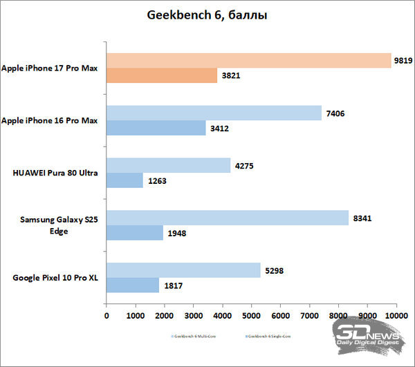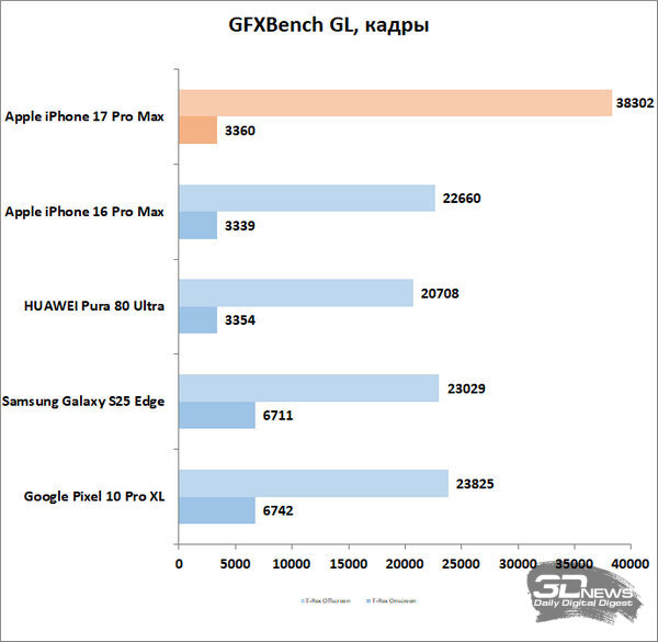 В прошлом году, напомню, айфоны чуть ли не впервые уступали по производительности актуальным флагманам на Android со свежей платформой Qualcomm. В этом году такой промашки Apple не допустила – по крайней мере, до выхода нового «снэпдрэгона» доминируя в основным бенчмарках. Не то чтобы эта гонка баллов в синтетических тестах была важна, современные старшие чипсеты довольно давно обеспечивают избыточную мощь, которая элементарно не используется – но факт остается фактом: iPhone 17 Pro Max – самый мощный смартфон на сегодняшний день. Комментировать еще как-то работу его в разных приложениях и играх не вижу смысла.