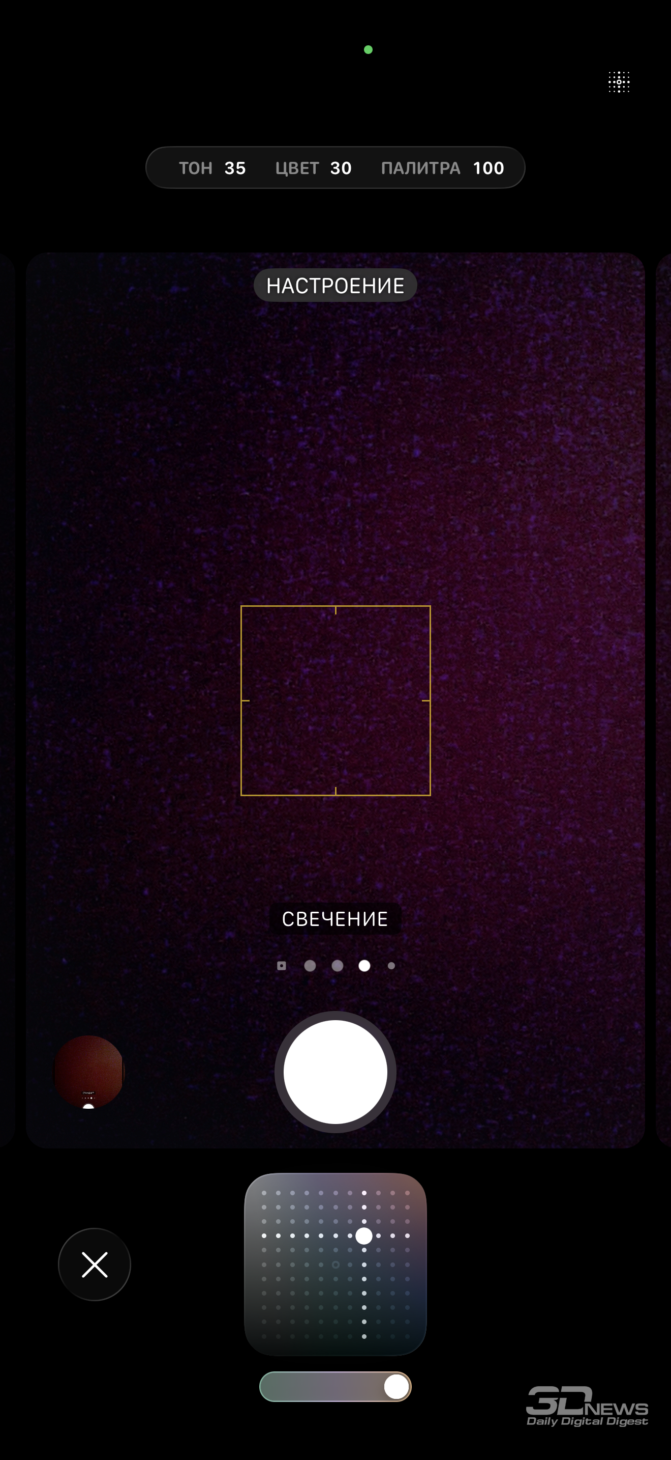 На месте и фирменные продвинутые фильтры – «Полутона» (или «Стили» - да, в меню камеры они называются именно стилями, а при активации мы видим заголовок «Полутона»). Пресетов по-прежнему 15, есть гибкая настройка каждого: регулируется тон, цвет (насыщенность) и палитра.