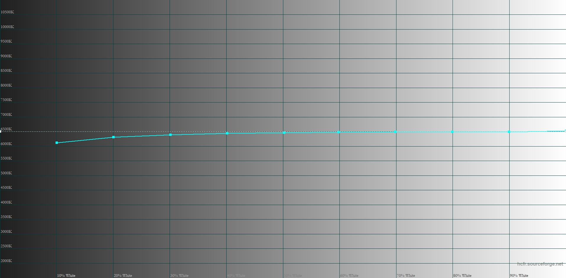 Apple iPhone 17 Pro Max, цветовая температура. Голубая линия – показатели Apple iPhone 17 Pro Max, пунктирная – эталонная температура