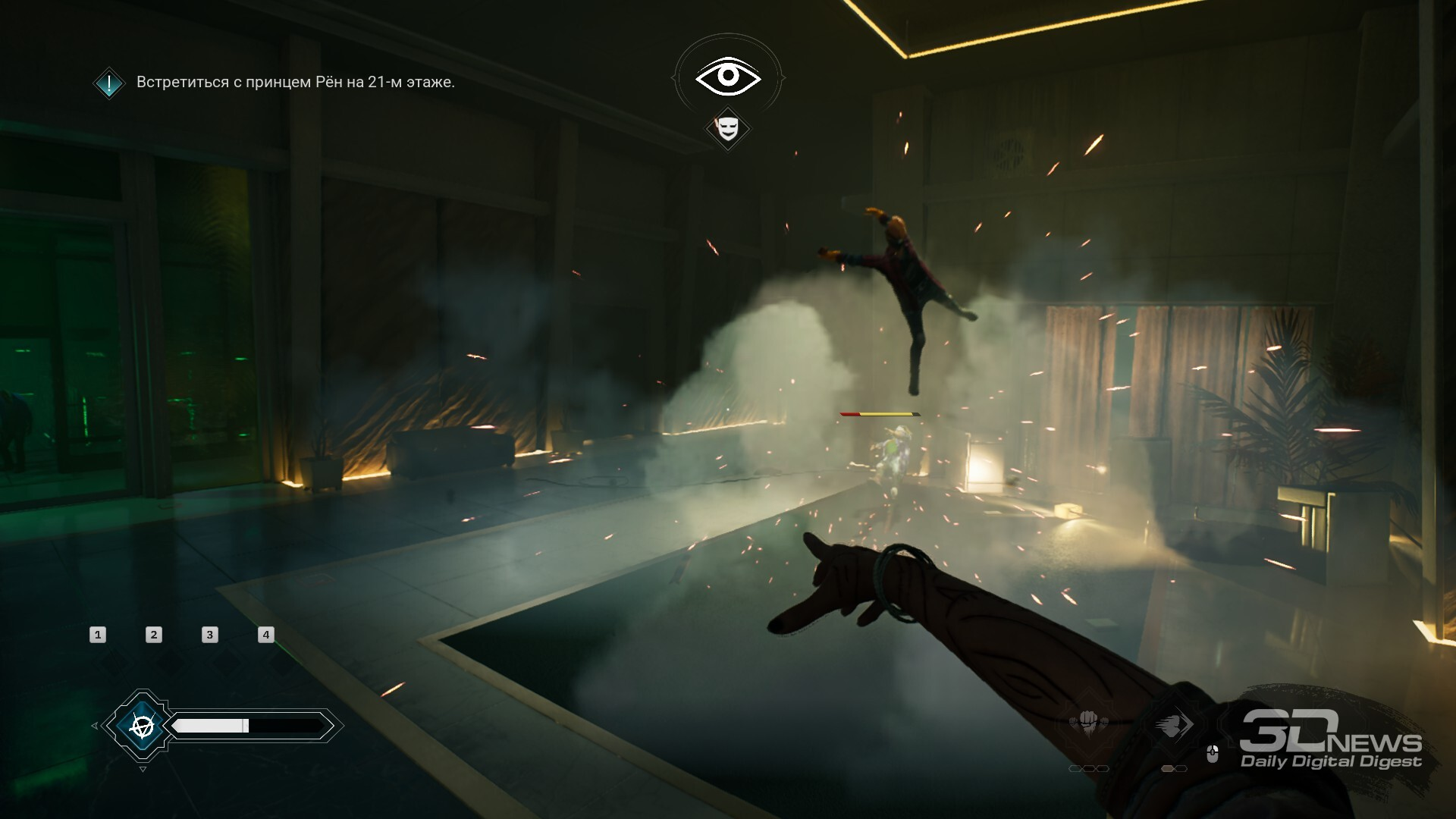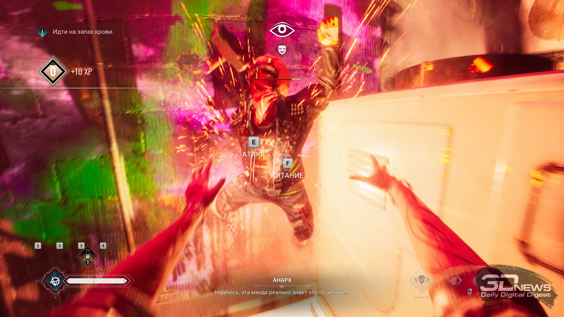 О том, что сама Bloodlines 2 куда уютнее чувствует себя в рамках экшена, чем RPG, говорит и боевая составляющая. Простая, но динамичная система ближнего боя, с возможностью использовать телекинез и вампирские способности, действительно удалась. Комбинации выходят зрелищные: разбиваете кулаком черепушку супостату, показываете средний палец (это часть классовой способности клана Бруха) бугаю с дробовиком, тот от злости выкидывает ствол и в ярости бежит на нас, но тут же встречает смертоносный заряд дроби из своего же ружья, которое мы быстро притянули к себе телекинезом. А потом можно с разгона ворваться в толпу оставшихся противников, протаранив одним супостатом пяток других, и закончить бой эффектным и мощным землетрясением, от которого бедолаги взмоют ввысь и тут же с силой будут вмяты в бетон.