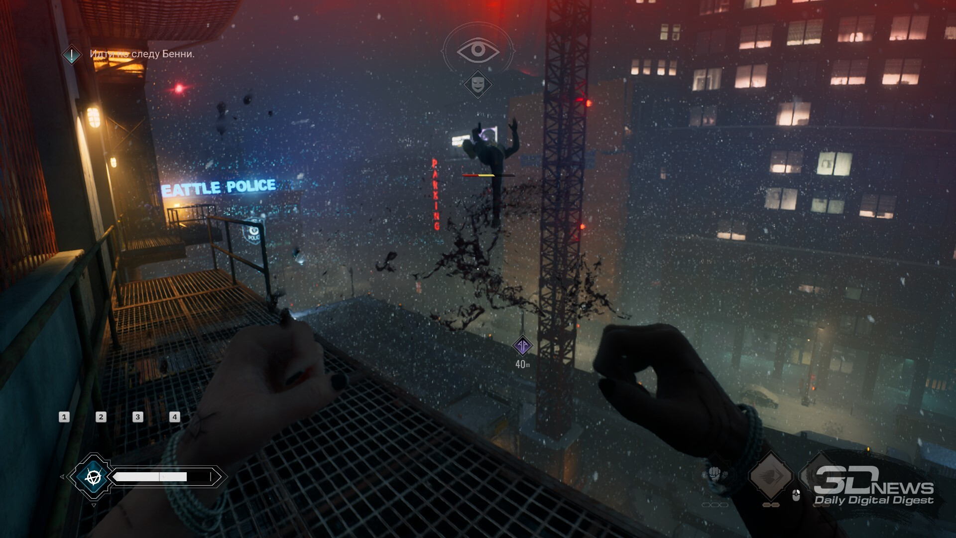 Удивительно, но непосредственно передвижение по городу — один из самых удачных элементов Bloodlines 2. В нашем распоряжении — высокие прыжки, подкаты, парение, ускорение, возможность пробегать небольшие отрезки по стенам вверх и цепляться за разные трубы, балконы и кондиционеры. Во время таких забегов даже проскакивает мысль: пусть из Bloodlines 2 и не вышло толковой ролевой игры, из неё мог бы получиться неплохой экшен в песочнице Сиэтла в духе Dying Light.