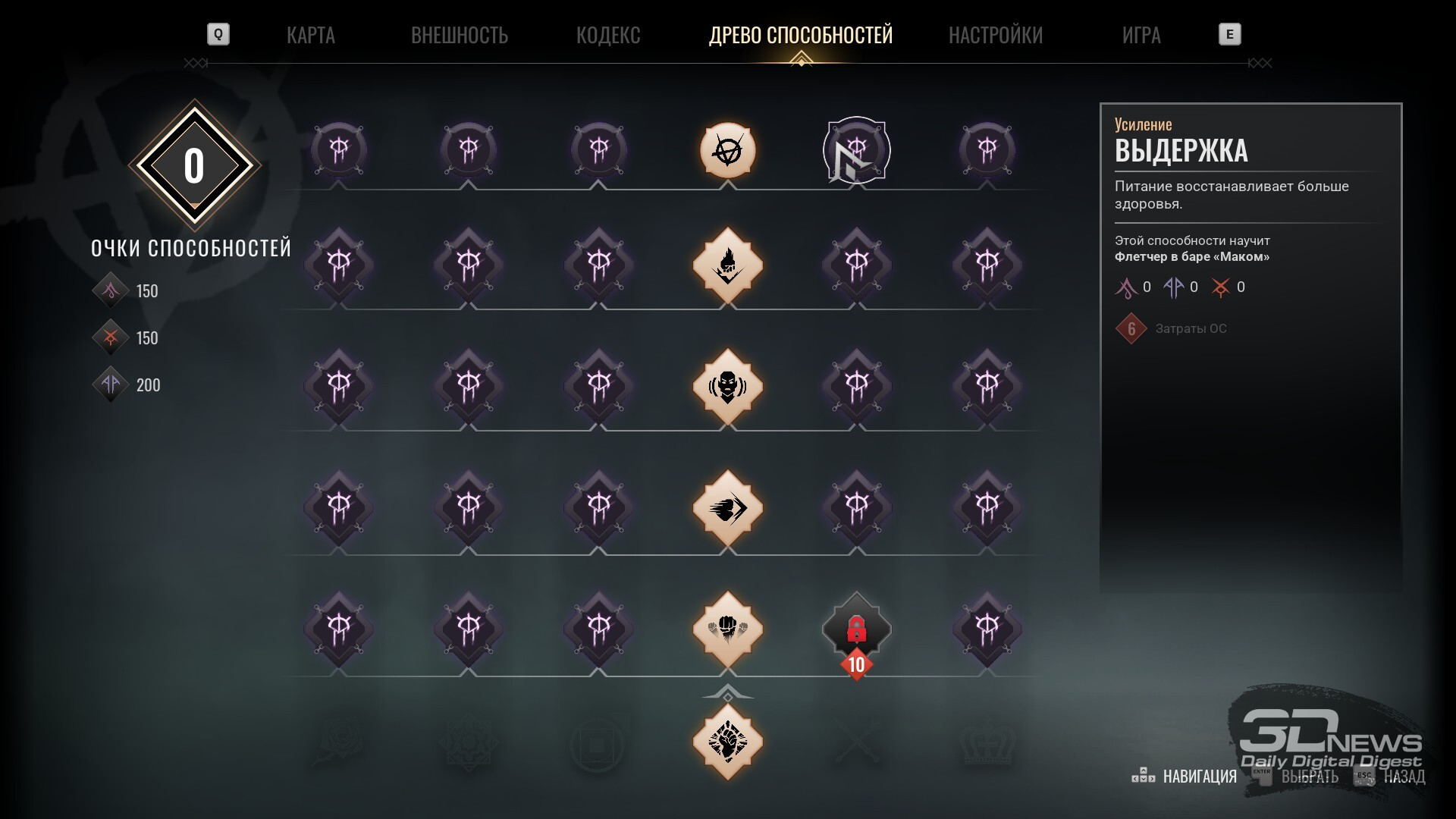 Древо (точнее, линии) прокачки предлагает исключительно боевые и стелс-опции — социальные возможности отсутствуют за ненадобностью