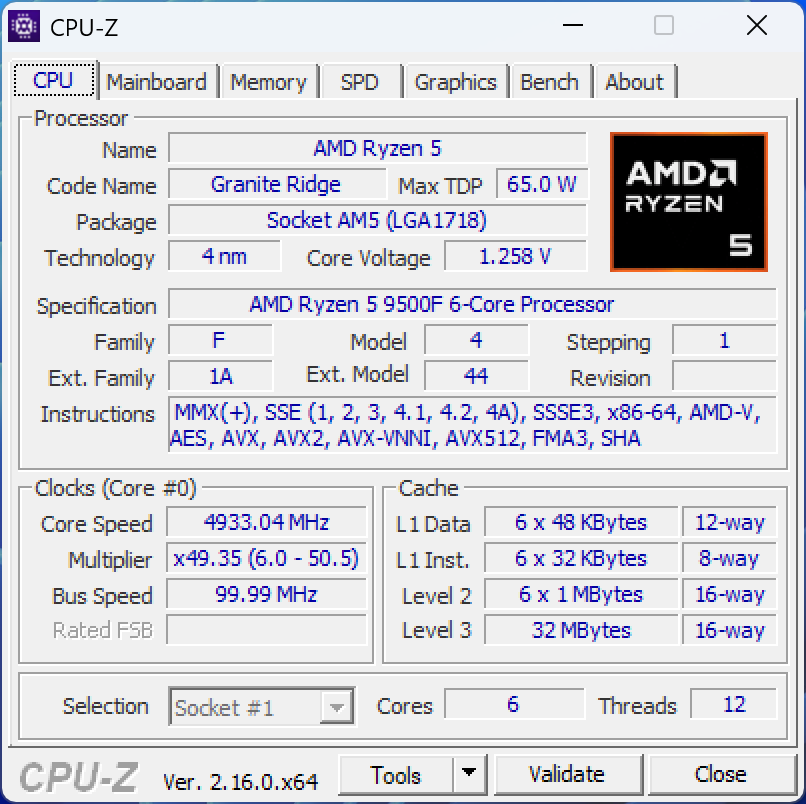 • AMD Ryzen 5 9500F (Granite Ridge, 6 ядер, 3,8-5,0 ГГц, 32 Мбайт L3);