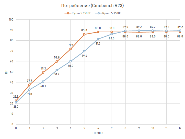 Чтобы лучше понять природу различий в частоте Ryzen 5 9500F и Ryzen 5 7500F, достаточно посмотреть на их практическое энергопотребление. Ryzen 5 7500F выходит на потребление максимально разрешённых 88 Вт лишь при восьмипоточной нагрузке, что с дальнейшим увеличением интенсивности вычислений как раз и заставляет его сбрасывать рабочую частоту. Но новый Ryzen 5 9500F упирается в тот же предел энергопотребления несколько раньше — при шести- и семипоточной работе, за счёт чего максимальная частота 5,05 ГГц доступна ему в более узком диапазоне нагрузок.