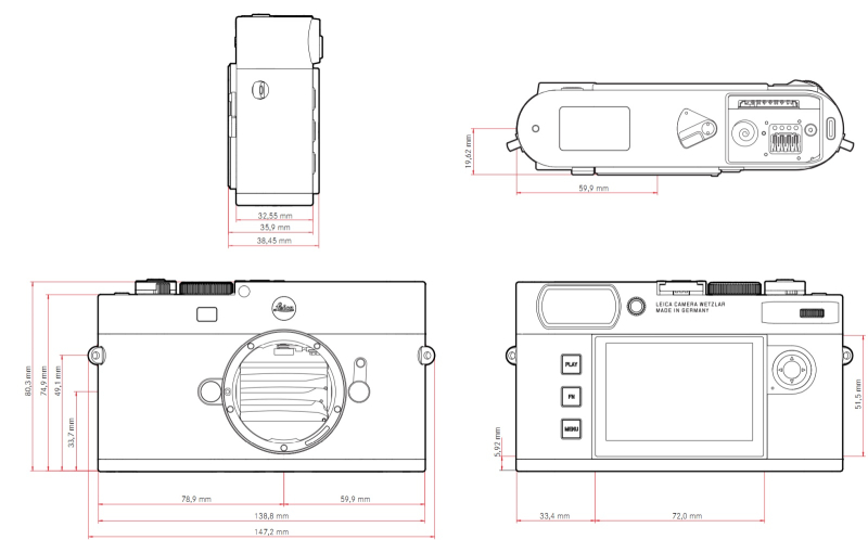 Корпус Leica M EV1 полностью изготовлен из магния и алюминия и покрыт искусственной кожей. Вес камеры составляет 484 г с аккумулятором и 402 г без аккумулятора. Размеры камеры приведены на изображении ниже.