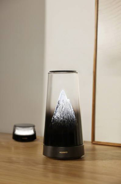 В X3 Pro конструкторы Huawei отказались от привычного дизайна с плоским корпусом, как у традиционных роутеров. Вместо этого новинка получила цилиндрический корпус с прозрачной верхней частью, сужающейся кверху, и излучающей мягкий свет, подсвечивающий макет горной вершины внутри.