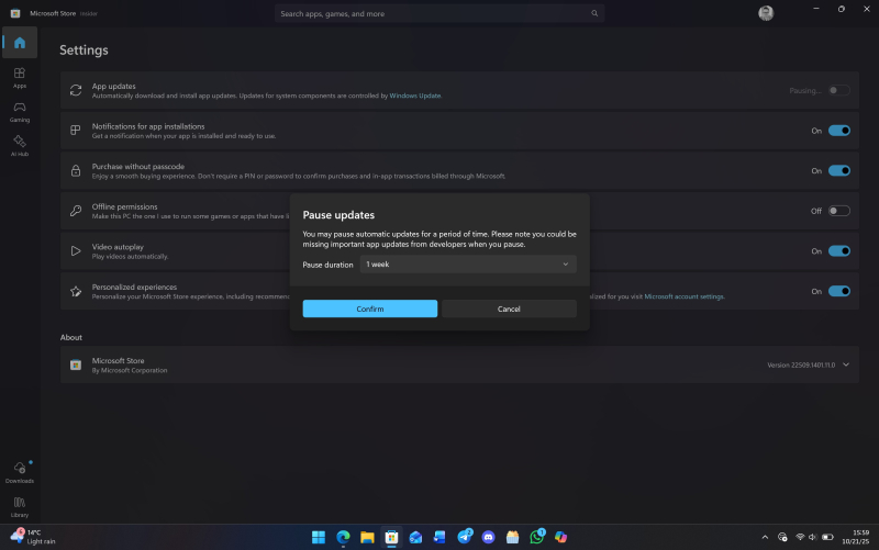 «Вы можете приостановить автоматическое обновление на определённый период времени», — говорится в Microsoft Store. Любопытно, что ни в одном журнале изменений последних обновлений Microsoft Store это изменение не упоминается.