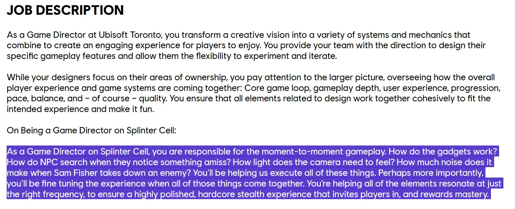«Вы будете помогать с тем, чтобы все эти элементы были настроены на правильную частоту и образовывали отполированный, хардкорный стелс-опыт, который приглашает игроков и вознаграждает мастерство», — гласил текст вакансии.