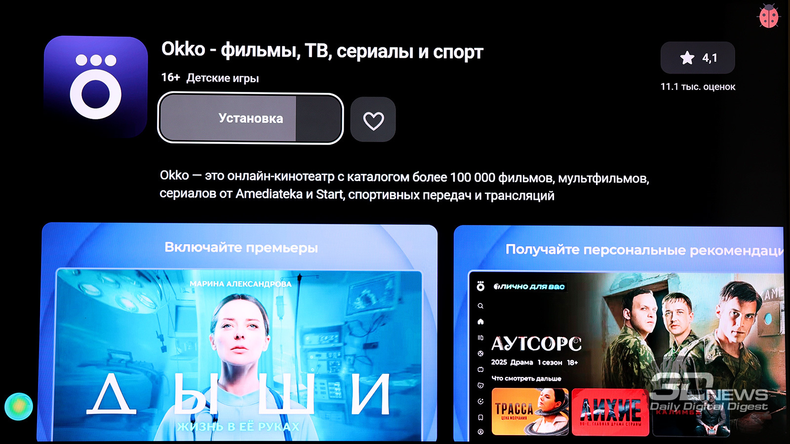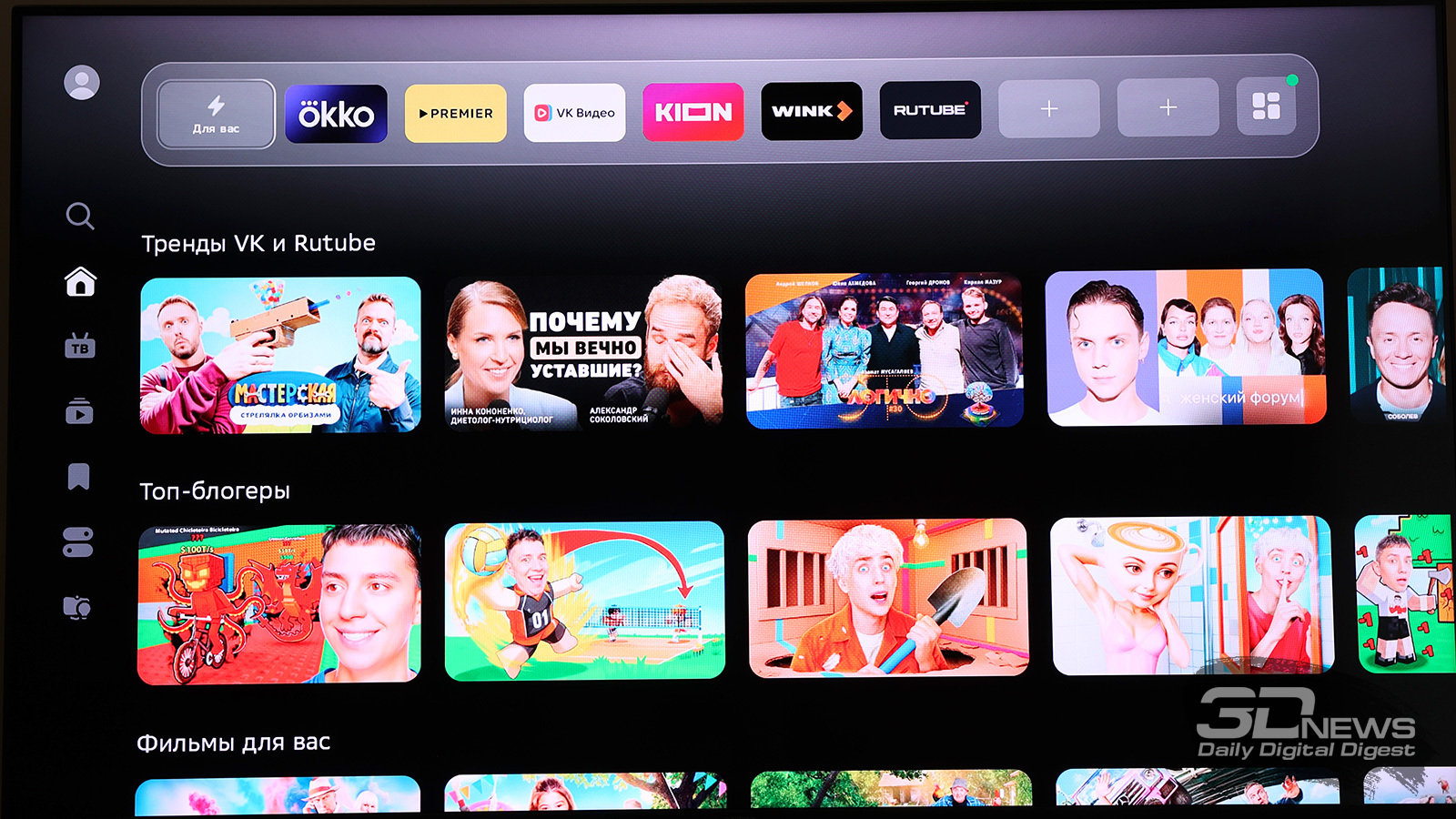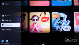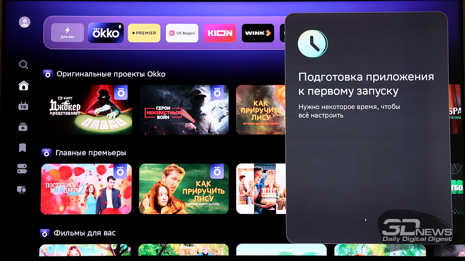 По умолчанию SberBox Max предлагает доступ к основным российским онлайн-кинотеатрам (Okko, Kion, Wink, Premier – «Кинопоиск» тоже есть, но он спрятан с главного экрана), Rutube и VK Видео. Цифровое телевидение тоже есть, причем при первой настройке приставка уточняет, через какой сервис вы будете им пользоваться – есть выбор. А вот мессенджер, который превосходно ловит даже на парковке, как можно было подумать из названия, не предустановлен.