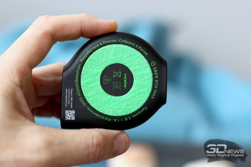 Я говорил, что SberBox Max отличается от SberBox первого поколения, о которой мы подробно рассказывали, но вот с вышедшей год назад SberBox 2 (которую мы, по сути, пропустили) внешне она практически идентична. Дизайн сохранен с мелкими, не обращающими на себя внимание нюансами. Он все так же напоминает «рулетку» - круглую, но со скошенными краями, куда вписаны интерфейсные порты. К первой SberBox, напомним, кабель был приклеен, отчего, если в нижней части вашего телевизора не было HDMI-порта, он сильно изгибался и мог со временем перетереться. Здесь же у вас есть свобода, как именно размещать приставку, кабель поставляется отдельно.