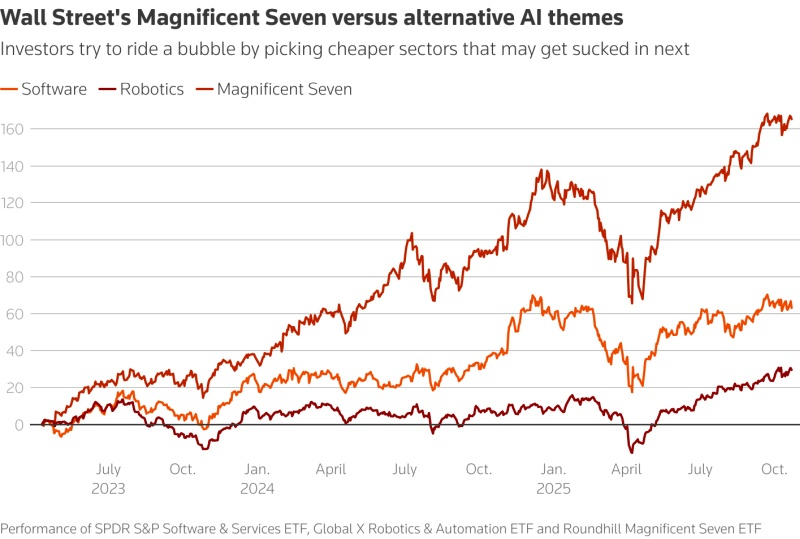 Многие инвесторы также пытаются извлечь выгоду из триллионов долларов, которые такие крупные IT-игроки как Amazon, Microsoft и Alphabet вкладывают в центры обработки данных для ИИ и передовые чипы, не принимая на себя прямых обязательств перед этими компаниями. Некоторые делают ставку на уран, ожидая строительства новых ядерных электростанций для обеспечения ЦОД электроэнергией, другие планируют заработать на поставке тары для производителей чипов.