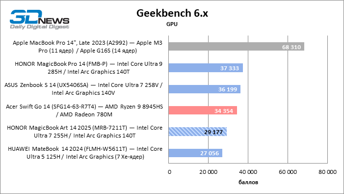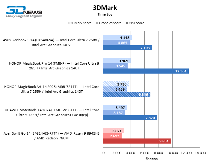 Благо в бенчмарках игрового рендеринга HONOR MagicBook Art 14 2025 уже не настолько отстает от устройств с большим резервом мощности SoC.