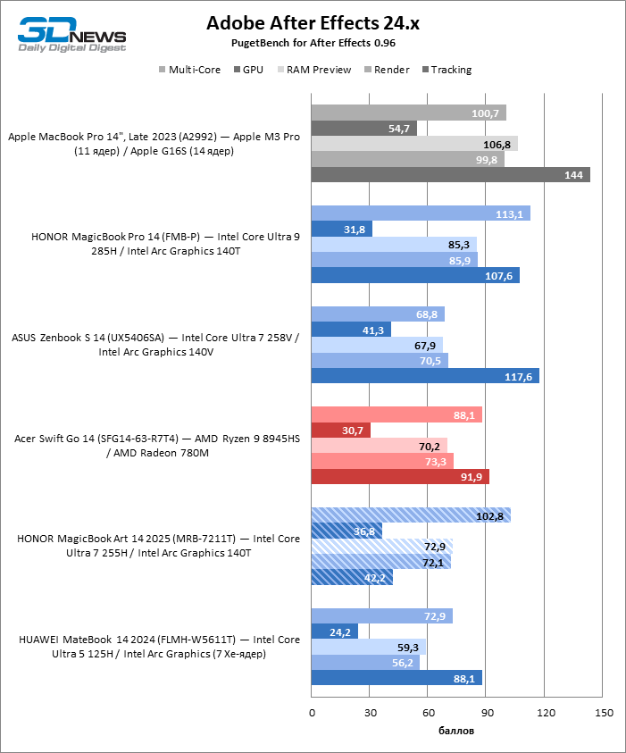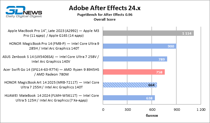 Наконец, объем оперативной памяти в 32 Гбайт позволил HONOR MagicBook Art 14 2025 завершить набор тестов After Effects, но подобные лэптопы определенно не предназначены для настолько ресурсоемких задач.