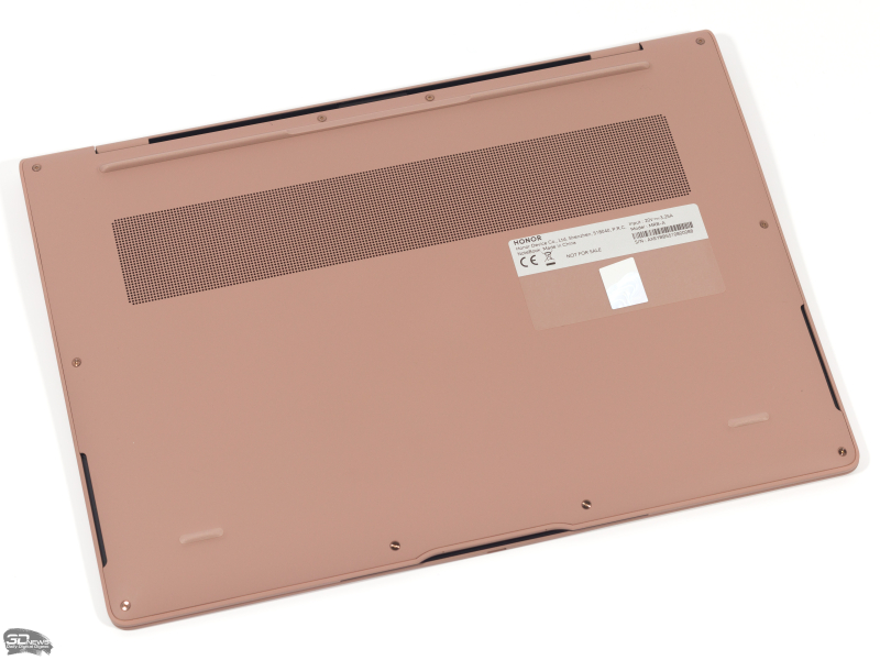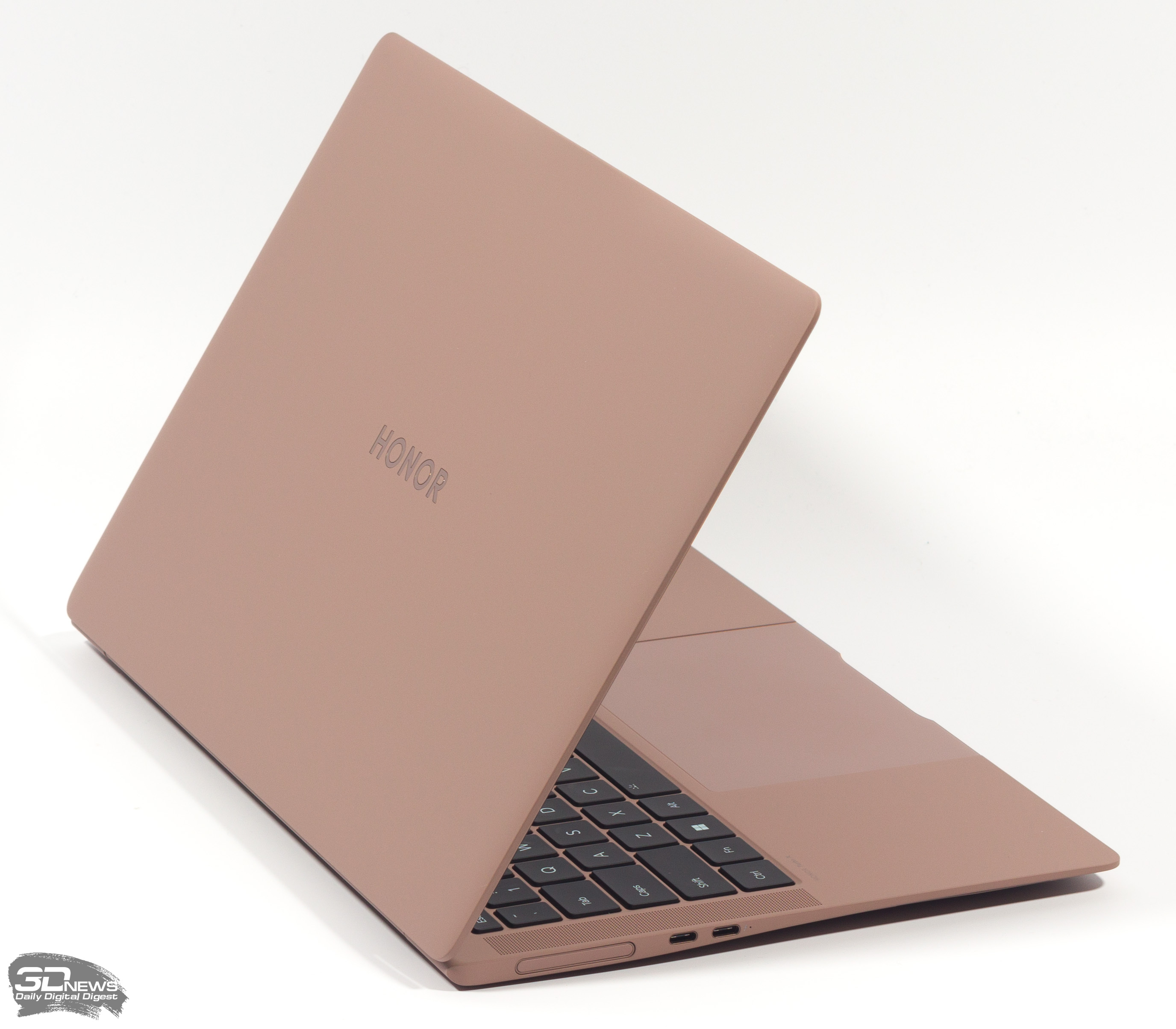 HONOR MagicBook Art 14 2025 собран в корпусе толщиной 11,5 мм, а весит чуть больше 1 кг. Шасси сделано из магниевого сплава, причем топкейс и крышка — фрезерованные. Толщина положительно сказывается на жесткости панелей, хотя при попытке деформировать нижнюю часть корпуса внутри что-то похрустывает. Лэптоп легко раскрывается одной рукой без необходимости придерживать топкейс. Магниевый сплав, в отличие от алюминия, требует сплошной окраски. Пепельно-розовое покрытие HONOR MagicBook Art 14 2025 имеет полуматовую текстуру, которая хорошо скрывает отпечатки пальцев.