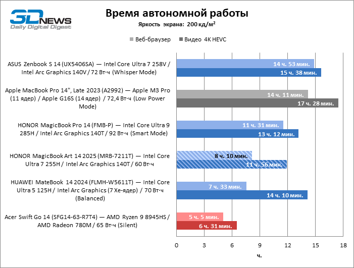 HONOR MagicBook Art 14 2025 выдержал почти 12 ч непрерывного просмотра видео при яркости 200 кд/м2, но лишь 8 ч работы в веб-браузере. Как ни крути, против новинки играет и небольшая емкость АКБ, и неспособность чипов x86 так же эффективно расходовать заряд, как умеют ARM'овские процессоры.