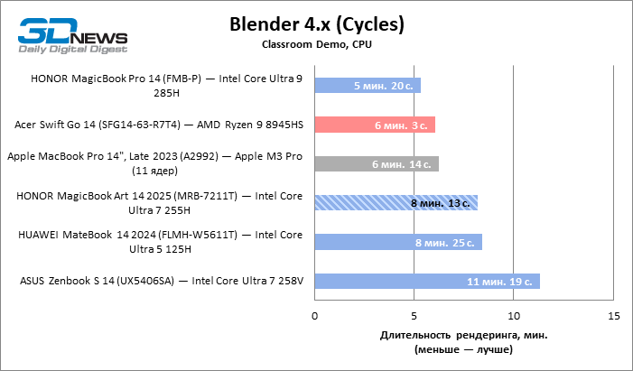 Задача рендеринга в Blender на ядрах CPU является мерилом многопоточной производительности, которая не относится к сильным сторонам HONOR MagicBook Art 14 2025. Тем не менее на графике с результатами теста чип Core Ultra 7 255H занял место сразу после Apple M3 Pro, пусть и с большим отставанием. Встроенную графику Intel Arc Graphics 140T для рендеринга в Blender использовать нельзя.