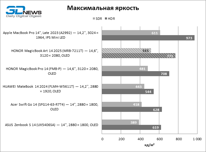 В MagicBook Art 14 2025 установлена OLED-матрица с частотой обновления вплоть до 120 Гц и глубиной цвета 10 бит на канал. Экран обладает впечатляющим запасом яркости 515 кд/м2 в режиме SDR и 771 в HDR (на белом пятне в 10 % площади экрана). При полной заливке экрана белым цветом яркость снижается до 416 и 741 кд/м2 соответственно.