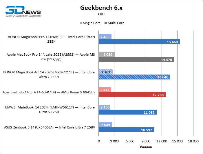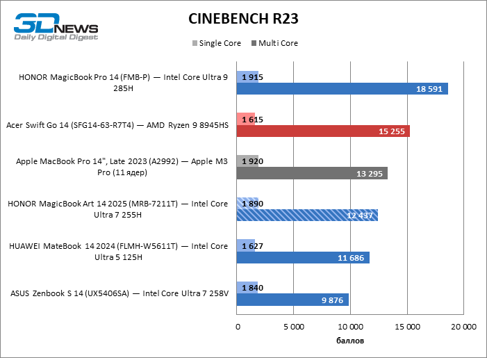 Чип Intel Core Ultra 7 255H в составе HONOR MagicBook Art 14 2025 пользуется небольшим резервом мощности, поэтому не может предложить настолько высокое многопоточное быстродействие, как у решений Intel и AMD с высоким TDP. Вместе с тем процессор обладает отличной скоростью в однопоточном режиме и по обеим метрикам бенчмарка Cinebench приближается к 10-ядерному Apple M3 Pro.
