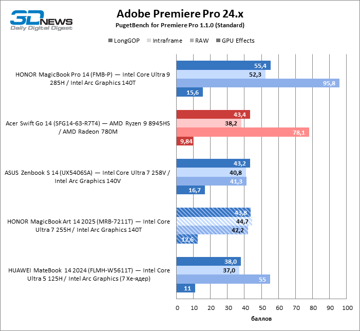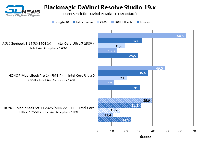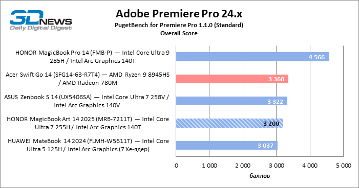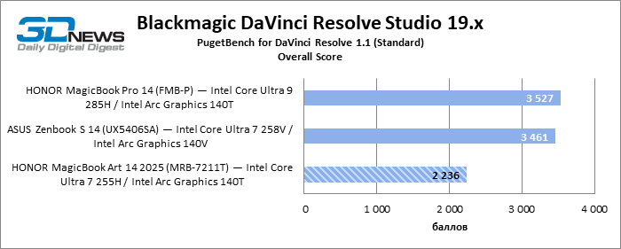 База результатов теста DaVinci Resolve недостаточно велика, чтобы поместить оценки HONOR MagicBook Art 14 2025 в широкий контекст. Можно лишь констатировать, что резерв мощности центрального процессора имеет больший вес в этом видеоредакторе, нежели в Premiere Pro.