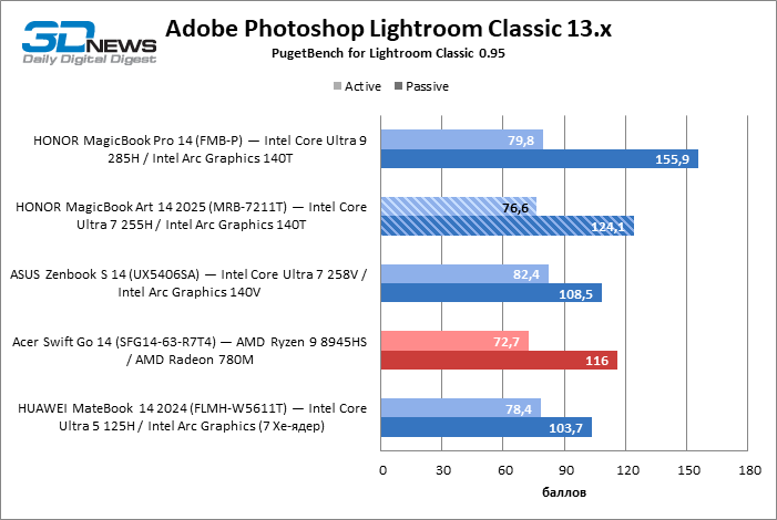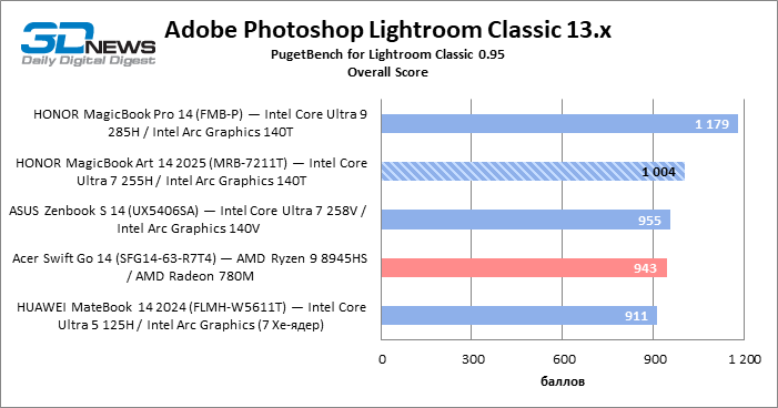 Интеловская платформа получила традиционно высокую оценку в бенчмарке Lightroom. Более того, здесь HONOR MagicBook Art 14 2025 пропустил вперед только машину с мощным процессором Core Ultra 9 285H.