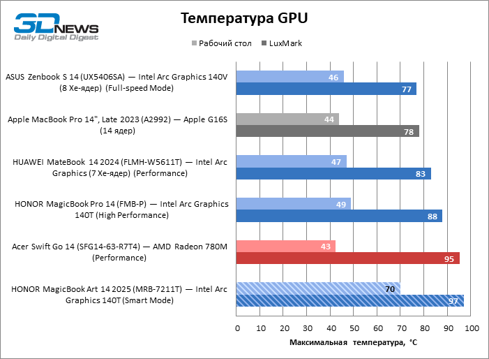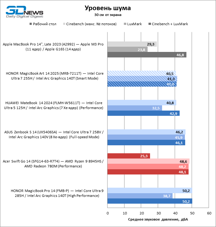 | HONOR MagicBook Art 14 2025 (MRB-7211T) — Intel Core Ultra 7 255H / Intel Arc Graphics 140T — Smart Mode | 27 | 31 | 26 | 28 | 26 | 29 | Н/Д | Н/Д |