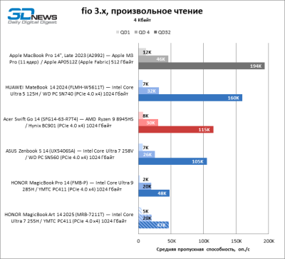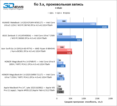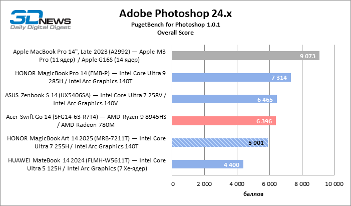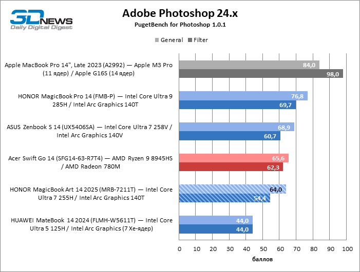 В тесте Photoshop, напротив, малый резерв мощности центрального процессора HONOR MagicBook Art 14 2025 не позволил чипу достигнуть уровня Ryzen 9 8945HS, не говоря уже о более производительных решениях Intel и Apple.
