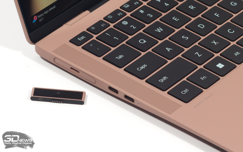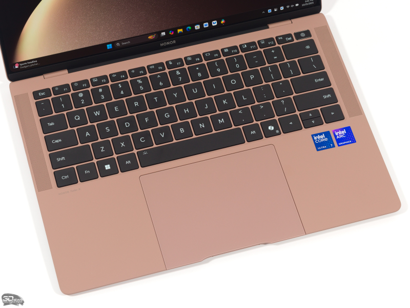 Клавиатура лэптопа — под стать тачпаду. Клавиши имеют большие плоские крышки, а механизмы немного вязкие на ощупь, но быстро возвращаются в нейтральное положение. Топкейс испытывает небольшую деформацию под сильным нажимом, но в процессе печати прогиб все равно несравненно меньше, чем у лэптопов со штампованным топкейсом. При ударе по клавишам нет ни вибрации, ни «барабанных» звуков. Подсветка символов — белая, двухступенчатая. В ряду функциональных клавиш находится кнопка включения с интегрированным сканером отпечатков пальцев. Это единственное средство биометрической аутентификации в HONOR MagicBook Art 14 2025, так как съемная веб-камера ноутбука не совместима с Windows Hello (да и подключать ее каждый раз для входа в Windows было бы очень неудобно).