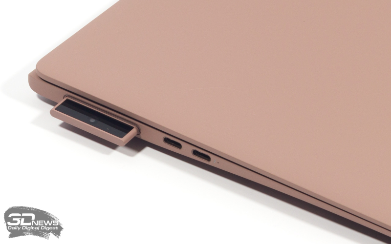 Отступ вокруг экрана имеет одинаковую ширину по бокам и сверху благодаря тому, как оригинально создатели ноутбука решили вопрос с веб-камерой. Камера прячется в кармашке на левом боку корпуса и извлекается нажатием, а отверстие тут же закрывает подпружиненная дверца.