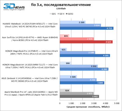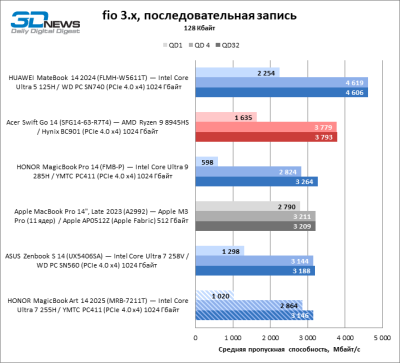 | HONOR MagicBook Pro 14 (FMB-P) | 14,6'', 3120 × 2080, OLED | Intel Core Ultra 9 285H | 6/6 ядер/потоков (2,9–5,4 ГГц) + 8/8 ядер/потоков (2,7–4,5 ГГц) + 2/2 ядра/потока (1,0–2,5 ГГц) | LPDDR5X SDRAM (8400 МТ/с, 4 × 32 бит) 32 Гбайт | Intel Arc Graphics 140T | Системная RAM | YMTC PC411 (PCIe 4.0 x4) 1024 Гбайт | 92 Вт⋅ч |