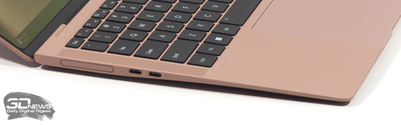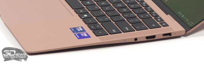 На левом боку корпуса расположен порт Thunderbolt 4 и USB Type-C стандарта 3.2 Gen 2, на правом — USB 3.2 Gen 1 в форм-факторе Type A, полноразмерный HDMI и акустический миниджек. Для картридера, к сожалению, места не нашлось.