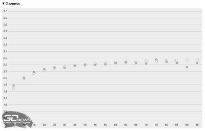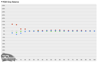 Балан серого стабилен на протяжении большей части шкалы яркости за исключением нижних 20 %.