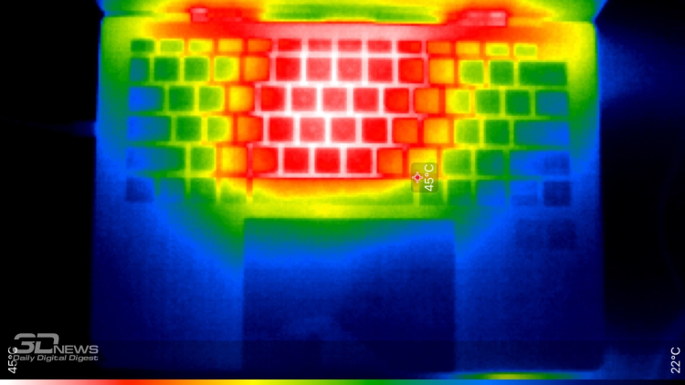 Температура топкейса под максимальной вычислительной нагрузкой не превышает 45 °C, что является превосходным результатом.