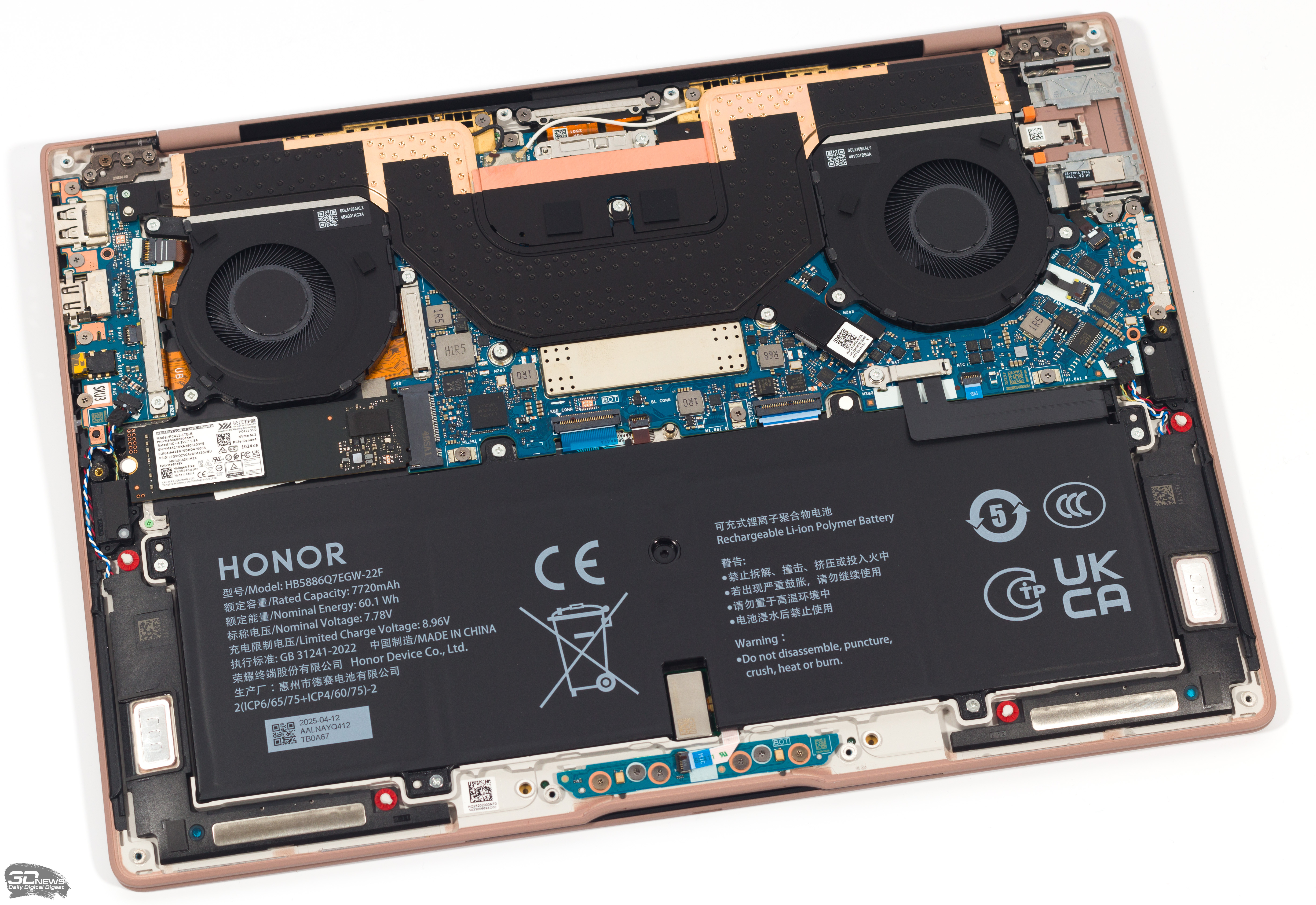 Два радиальных вентилятора выдувают нагретый воздух в зазор между топкейсом и экраном, а вместо тепловых трубок используется испарительная камера. Чипы оперативной памяти LPDDR5X распаяны на материнской плате, а вот твердотельный накопитель, подключенный к разъему M.2, можно заменить. Однако владельцам HONOR MagicBook Art 14 2025, которые планируют самостоятельный апгрейд SSD, нужно иметь в виду, что днище корпуса, помимо винтов с Torx-головкой, держится на очень тугих защелках и снять его непросто.
