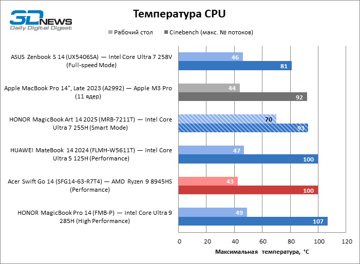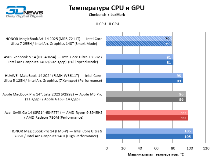 Несмотря на то, что в основе системы охлаждения HONOR MagicBook Art 14 2025 лежит испарительная камера, после длительного прогрева кристалл SoC достигает температуры 97 °С. При этом новый лэптоп HONOR шумит заметно меньше, чем другие участники сравнения на платформе x86, но большинство из них обладают куда более прожорливыми центральными процессорами.