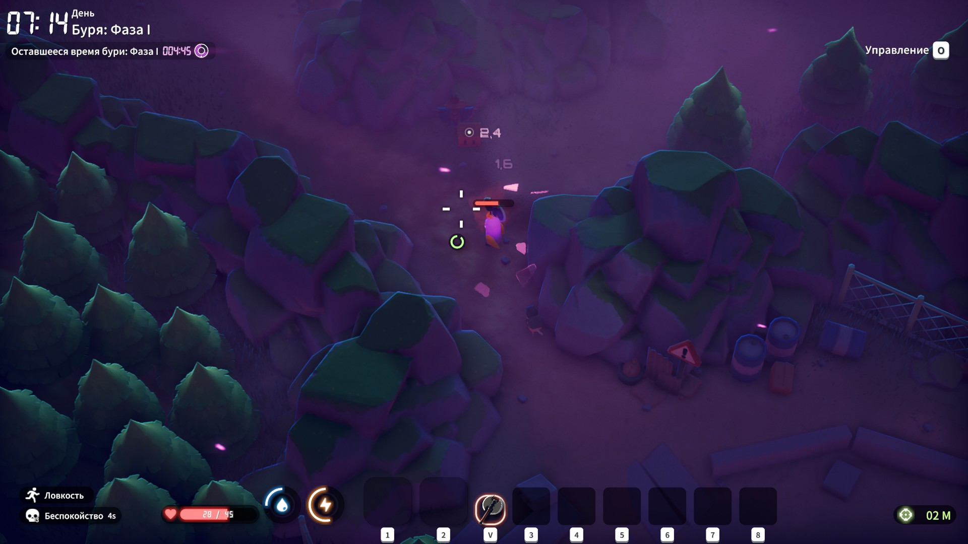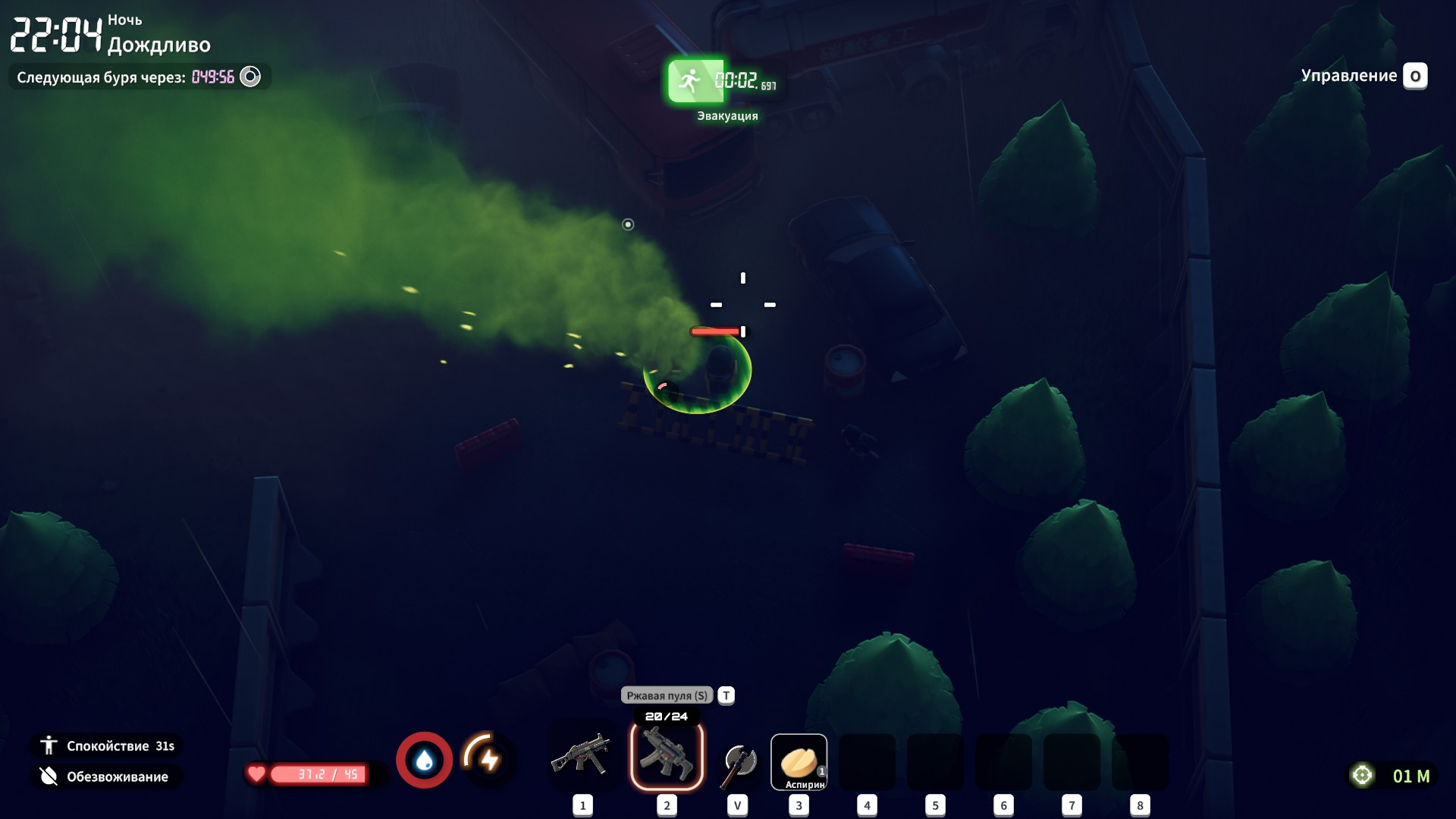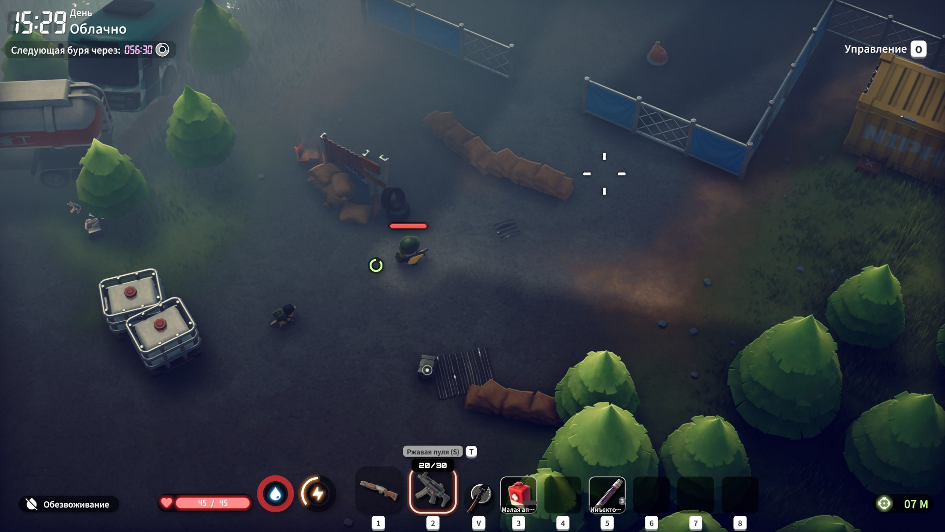 У подконтрольной утки реалистично ограничен обзор, а потому частенько приходится ориентироваться на слух Впрочем, даже самый чахлый элемент арсенала можно улучшить парой модулей вроде дульного тормоза, разных прицелов, лазерных целеуказателей и более удобных прикладов. Так можно уменьшить отдачу, повысить кучность стрельбы или увеличить точность. Сами обвесы можно как снимать с «трофейных» стволов, так и покупать на базе. А если финансы позволяют, можно ещё и докупить подходящих патронов, чтобы не переживать из-за этого на вылазке. А ещё — присмотреться к броне покрепче, рюкзаку повместительнее и разным расходникам. Лучше всего иметь в инвентаре предметы на все случаи жизни, ведь погибнуть на просторах Дакова можно не только из-за острого отравления свинцом. Вовремя не перемотаете рану бинтом — смерть; своевременно не перекусите — смерть; не попьёте — не смерть, но ваша эффективность ощутимо упадёт. Да и многие окружающие факторы частенько создают условия для возвращения на базу самым быстрым путём (через смерть). Например, на гибнущей планете регулярно бушуют бури, во время которых крайне нежелательно находиться под открытым небом. Вылазка в ночное время тоже не сулит ничего хорошего — после 22:00 на местности появляются особо опасные противники, которых и при полной выкладке одолеть будет непросто. Правда, и добыча может оказаться весьма ценной.