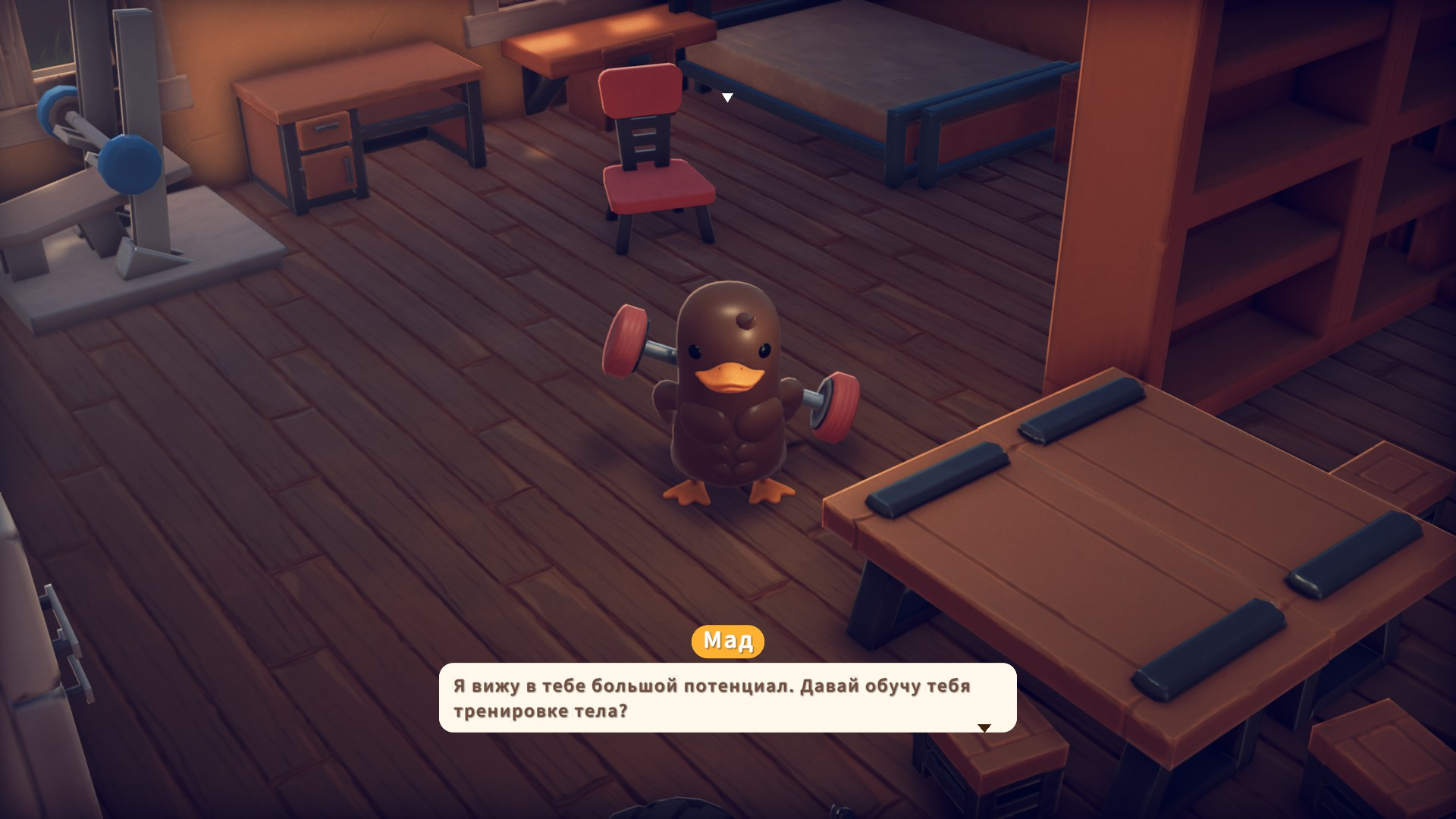 Талисманы могут ощутимо повысить шансы на выживание. Получить такой можно как за выполнение задания, так и в обмен на перья убитых противников А хорошая добыча — двигатель прогресса! Ведь разные улучшения требуют не только пригоршню валюты и необходимый уровень прокачки, но и самых разных предметов. Например, инвестиция морковью в определённый талант повысит точность; понизить разброс оружия можно, вложив в прокачку часы (не спрашивайте, как это работает); а чтобы увеличить вместимость рюкзака, понадобится инъекция грузоподъёмности. Чем дальше мы заходим в изучении Дакова, чем свирепее испытания и чем крепче и точнее становятся утки-противники, тем больше разнообразных ответов на сложные вопросы появляется на базе. Скажем, с постройкой качалки вам откроются разные физические улучшения вроде повышенной выносливости или увеличенного запаса энергии. Другие сооружения открывают расширенные возможности для работы с арсеналом, а третьи расширяют ассортимент товаров (найдутся даже ресурсы, необходимые для дальнейшей прокачки).