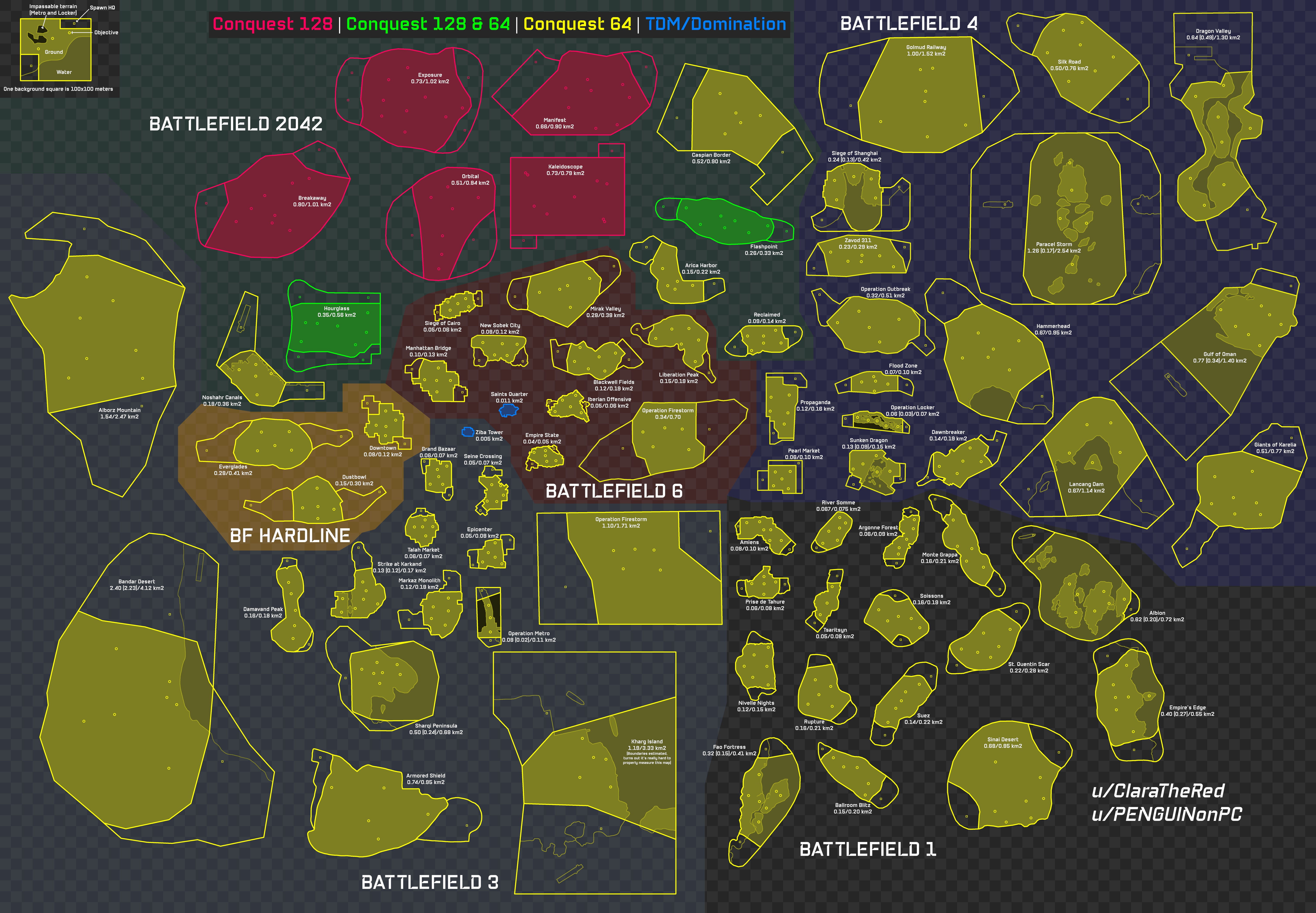 Как подметил портал PC Gamer, пользователи ClaraTheRed и PENGUINonPC с форума Reddit тщательно сравнили игровые зоны на картах в серии, начиная с Battlefield 3 и заканчивая Battlefield 6, чтобы оценить их размеры.