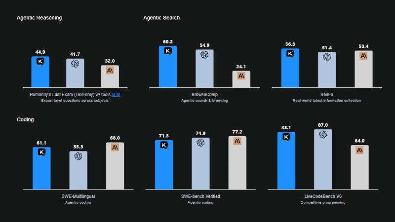 В самом сложном мультидисциплинарном тесте Humanity's Last Exam (HLE), который включает около 3000 задач по математике, естественнонаучным и гуманитарным дисциплинам, Kimi K2-Thinking заняла первое место среди всех моделей, оставив позади GPT-5 и Claude Sonnet 4.5. Она успешно справилась с подключением инструментов для HLE, выполняя до 120 шагов. Доступен также режим Heavy, позволяющий Kimi K2-Thinking работать на уровне GPT-5 Pro и Grok 4 Heavy: параллельно запускаются восемь экземпляров модели, все дают ответы на запрос, из которых собирается окончательный. В бесплатном чат-боте эта ресурсоёмкая версия отсутствует.