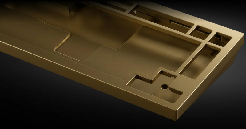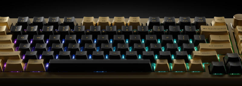 Здесь те же TMR-датчики, три способа подключения к компьютеру, та же алюминиевая панель переключателей — и вдобавок винтовые стабилизаторы, которые сделают работу с клавиатурой тише. Колпачки клавиш выполнены в двух вариантах: в основном наборе они чёрные с медными обозначениями, а другие, наоборот, выкрашены в медный цвет и имеют чёрные обозначения; медную окраску имеет и программируемый регулятор.