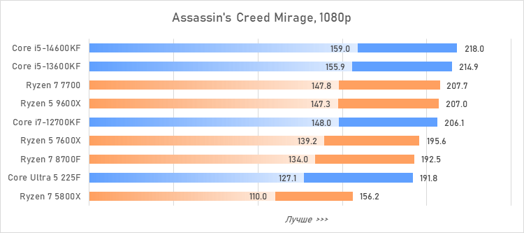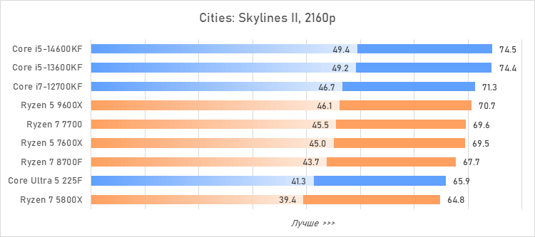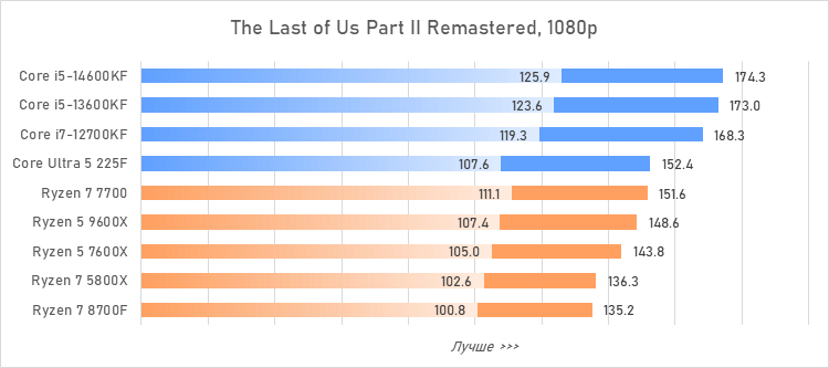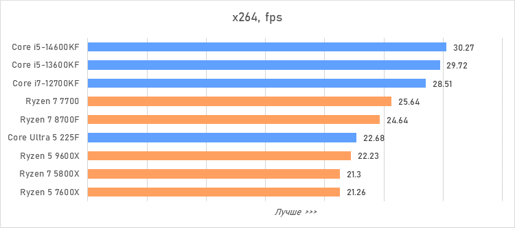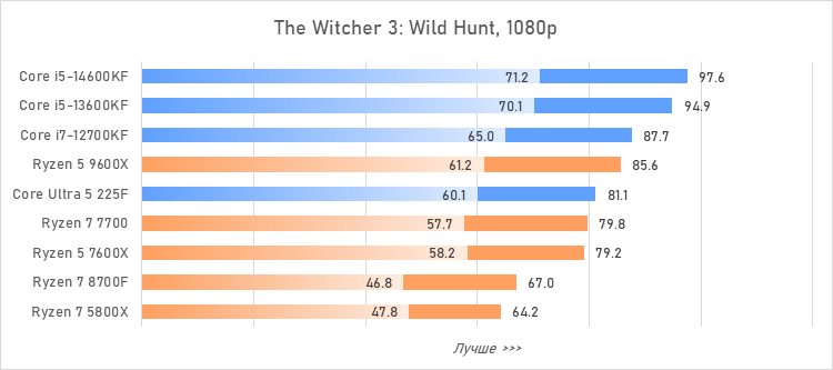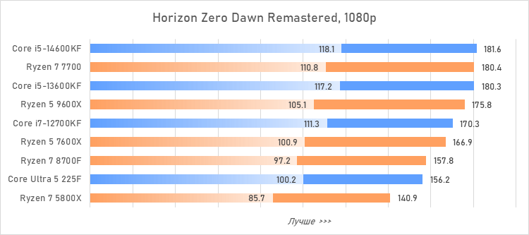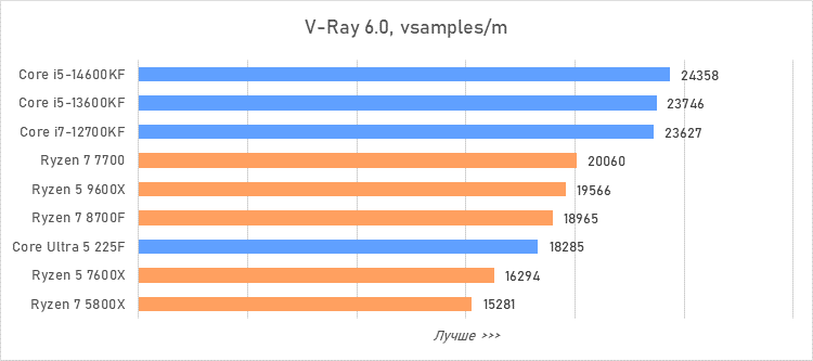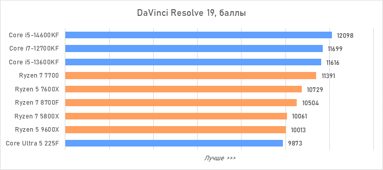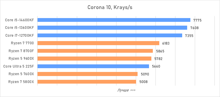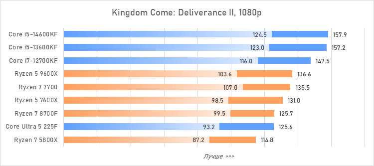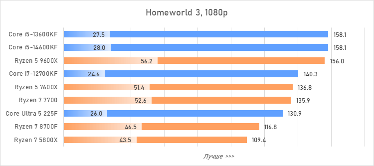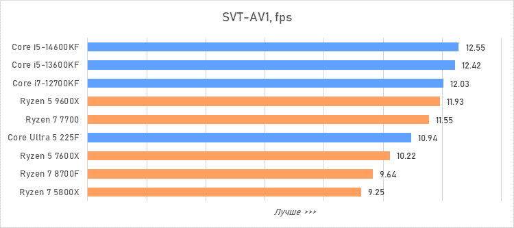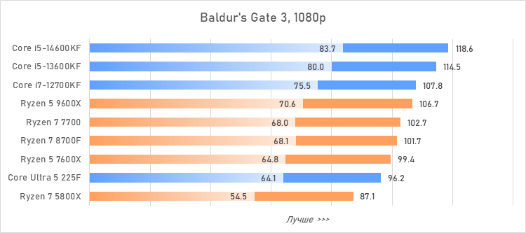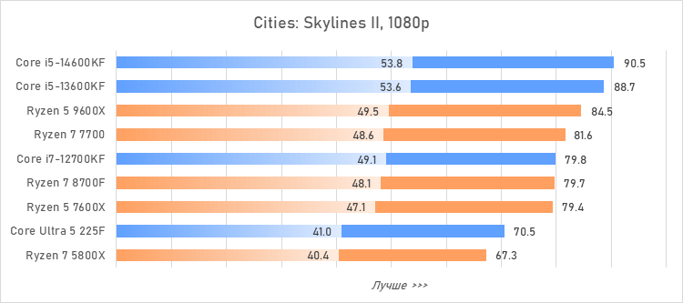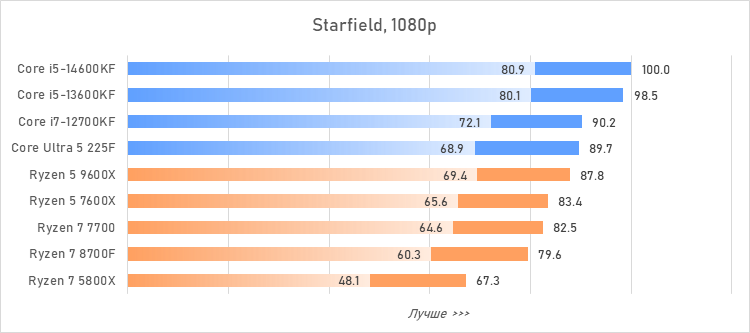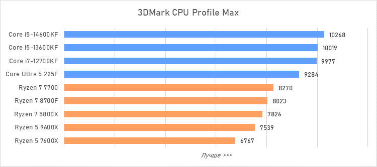 Таким образом, всё сказанное можно свести к довольно простому итогу. Для максимальной производительности прямо сейчас стоит выбирать Core i5-13600KF или Core i5-14600KF. Для сборки универсальной системы на перспективу лучше подойдут Ryzen 7 7700 или Ryzen 5 9600X в зависимости от приоритетов между рабочими задачами и играми. А для компактных и экономичных сборок можно рассмотреть Core Ultra 5 225F.