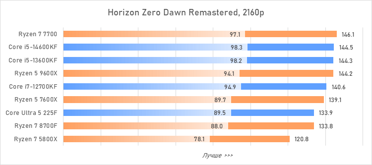 Что касается остальных участников теста, то все они на данный момент выглядят как проходные модели, не заслуживающие какого-либо внимания. Core i7-12700KF при нынешних ценах не имеет смысла, потому что Core i5-14600KF почти всегда быстрее. Ryzen 7 5800X слишком стар и по всем параметрам проигрывает современным решениям. Ryzen 7 8700F выглядит интересно на бумаге, но урезанный кеш снижает производительность в играх примерно на 9 %, и это слишком высокий штраф. Не имеет практического смысла и приобретение Ryzen 5 7600X — более новый Ryzen 5 9600X стоит лишь незначительно дороже, но при этом он лучше буквально во всём.