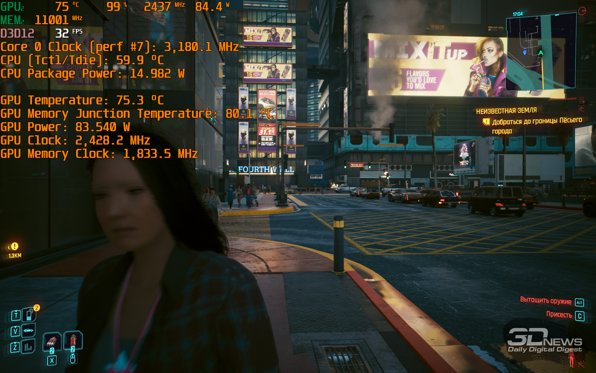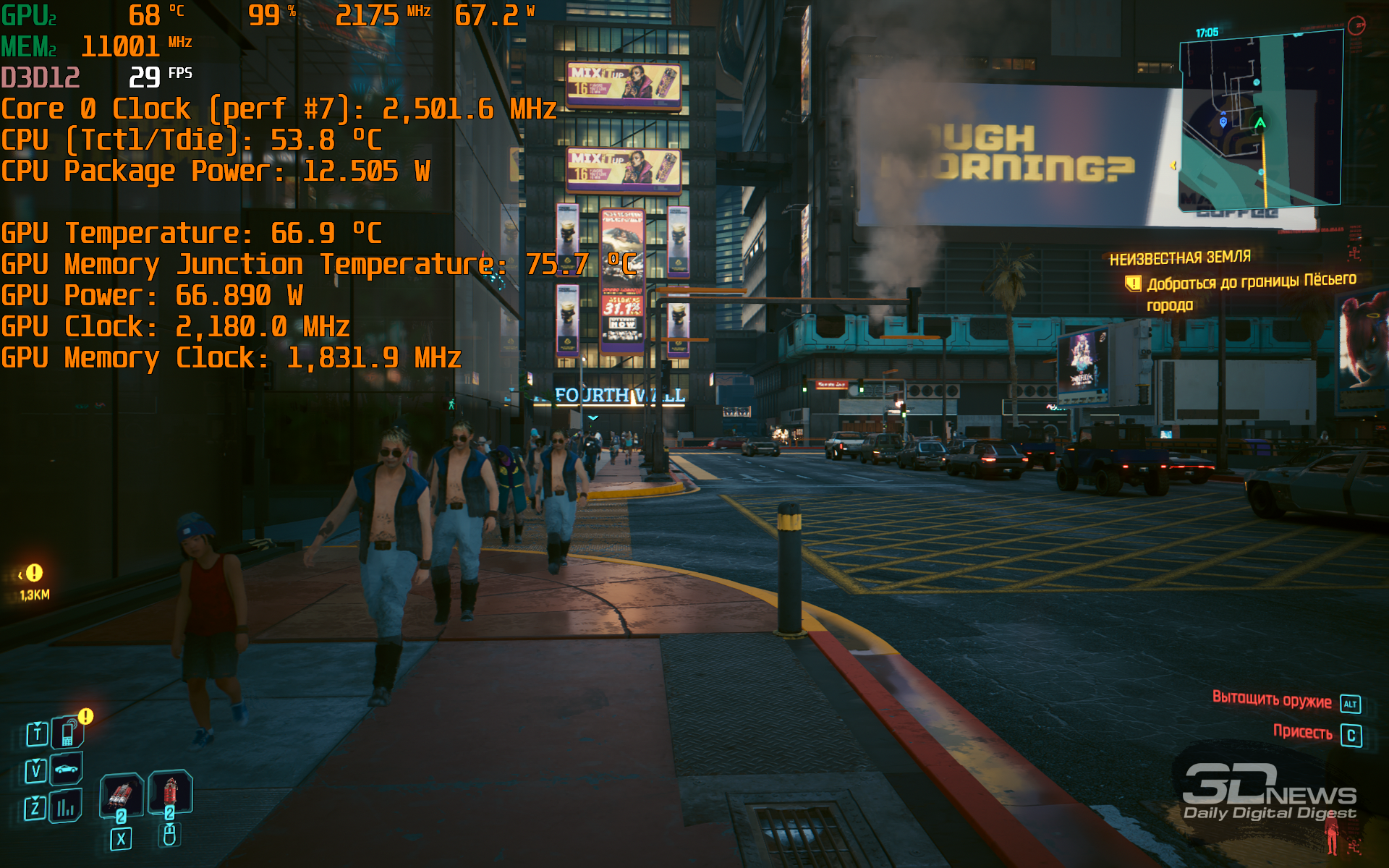 • Cyberpunk 2077. DirectX 12. Поездка в городе. Быстрая настройка качества — «Впечатляющее», масштаб разрешения — выкл., создание кадров — выкл., качество текстур — «Высокое», трассировка лучей — выкл., плотность толпы — «Высокая», обычные настройки — вкл. (высокое размытие при движении), NVIDIA Reflex — выкл.