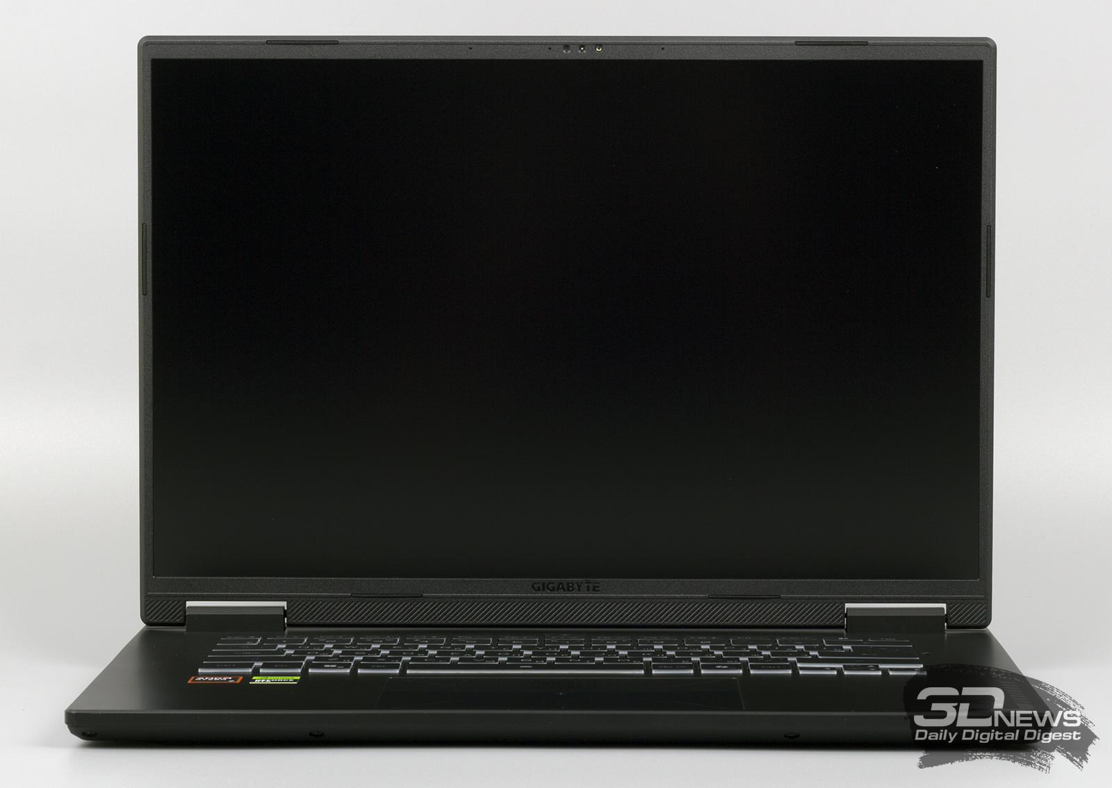 В конструкции шасси GAMING A16 3VH используются прочные тугие петли — крышка дисплея не раскрывается одной рукой. При этом максимальный угол составляет 180 градусов. Веб-камера, микрофон и датчики распложены сверху. Камера поддерживает разрешение 1080p.