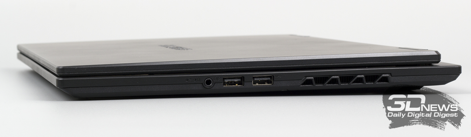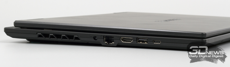 С функциональностью у «игробука» все в порядке — я твердо в этом уверен. С одной стороны, несколько архаично выглядит порт USB 2.0 на правой стороне корпуса. Но ведь дома к нему с вероятностью 99,9 % подключится мышь. С другой стороны, GAMING A16 3VH оснащен полноценным разъемом USB4. Интерфейс не только хвастает быстрым трансфером данных, но и поддерживает стандарт передачи изображения DisplayPort 1.4 и технологию Power Delivery 3.0.