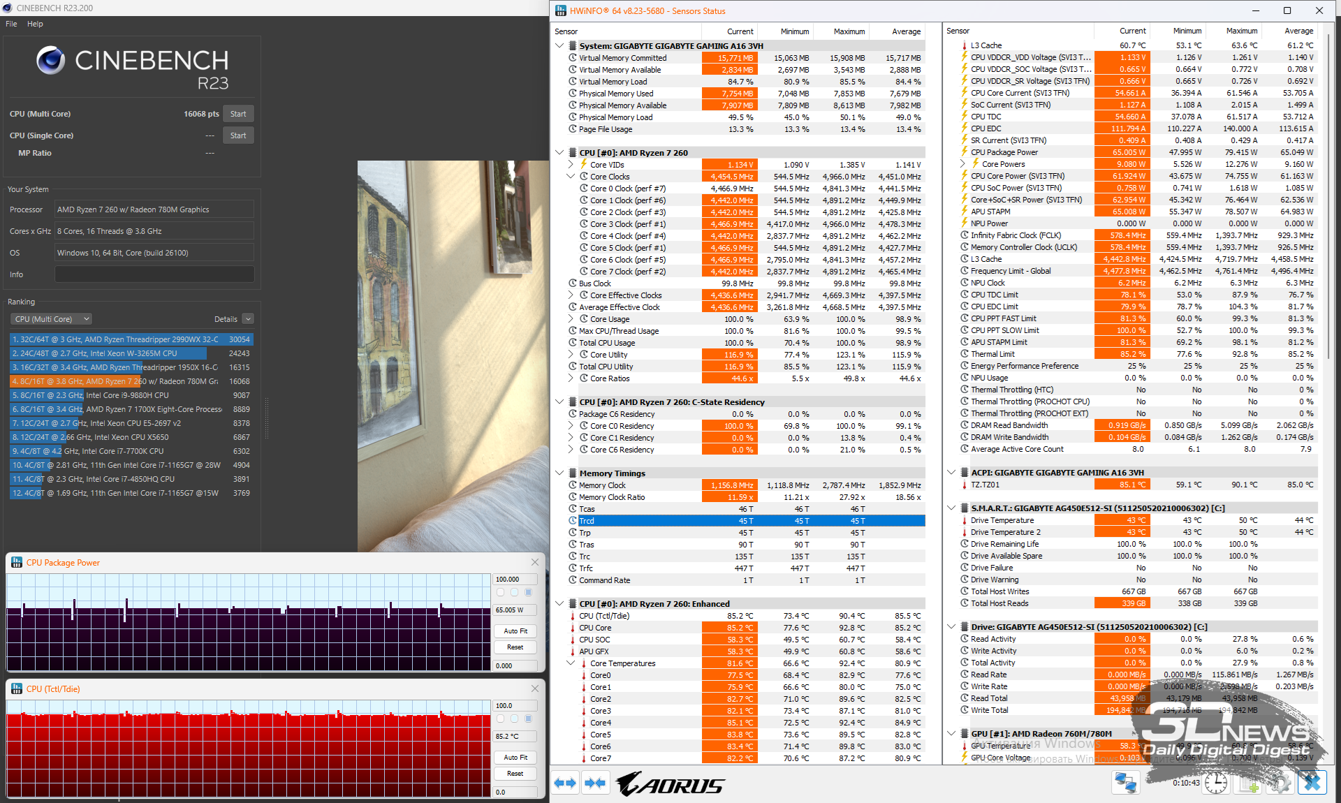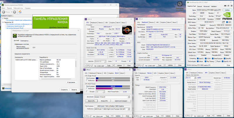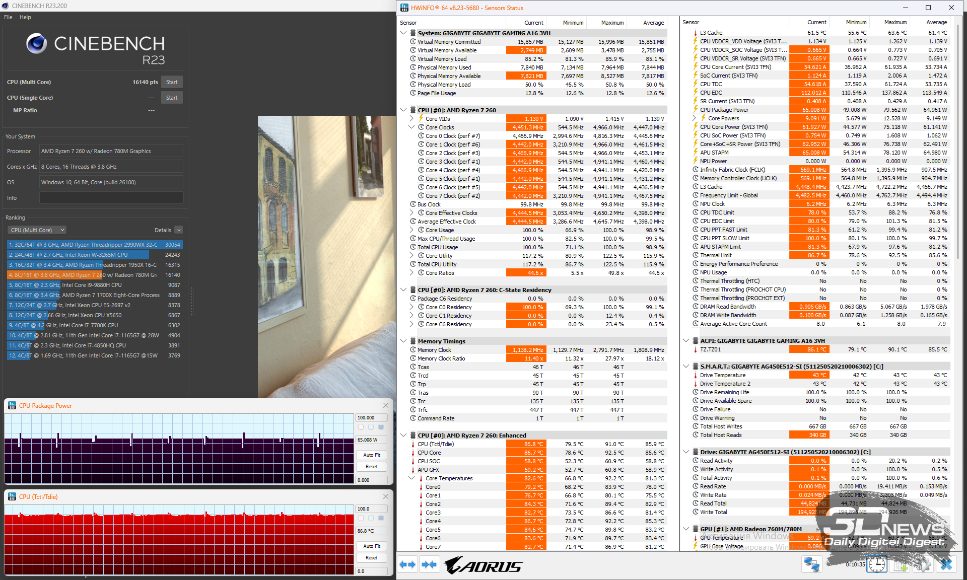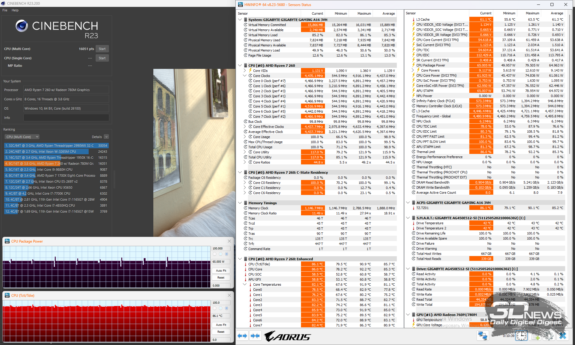 Как и ожидалось, в сценариях, нагружающих центральный процессор, ноутбук работает одинаково. Система разгоняет Ryzen 7 260 так, что частота всех его ядер держится отметки 4,5 ГГц. Среднее энергопотребление чипа составляет 65 Вт. В таких условиях кулер GAMING A16 3VH работает шумно, но полностью справляется со своей задачей. Перегрева кристалла, вызывающего сброс тактовой частоты ядер, не наблюдается. Что приятно, процессор в лэптопе не «долбится» в максимально допустимые для кристаллов поколения Zen 4 95 градусов Цельсия — как это происходит в некоторых настольных чипах AMD.