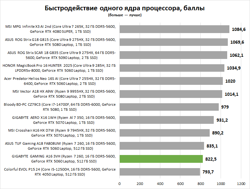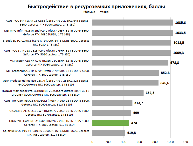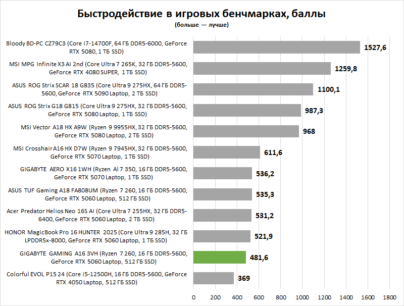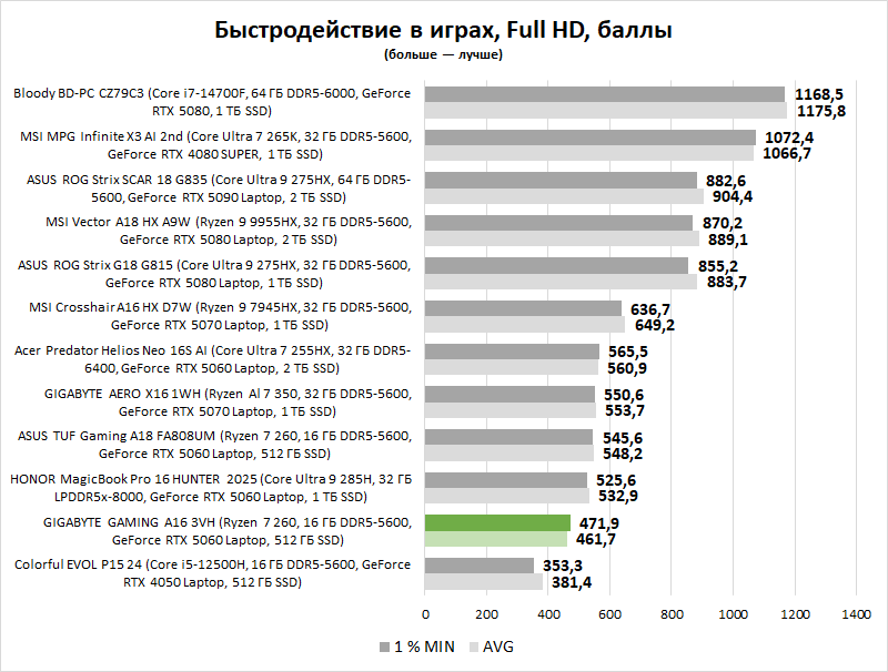 Для наглядного сравнения различных моделей ноутбуков, моноблоков и прочих игровых ПК мы ввели индекс производительности, в котором за 100 % приняты результаты тестирования эталонной системы. В ее состав входят центральный процессор Core i7-14700KF (профиль Intel), оперативная память DDR5-7600 (36-48-48-84), видеокарта GeForce RTX 5070 и твердотельный накопитель Intel 760p 2 Тбайт. Баллы рассчитываются в процентах от быстродействия эталонной игровой системы, умноженных на 10. В стенде использовалась операционная система Windows 11 со всеми установленными обновлениями (весна 2025 г.) и драйверами, включая GeForce Game Ready Driver 576.40 и Intel Chipset Driver 10.1.20020.8623.