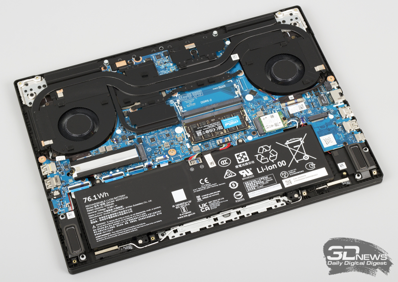 Заглянуть под пластиковый кожух GAMING A16 3VH точно придется со временем. Во-первых, никто не отменял планового обслуживания системы. Кулер ноутбука состоит из двух вентиляторов, четырех радиаторов и такого же количества медных теплотрубок. Центральный процессор и графический чип охлаждаются единой системой. Еще по одной теплотрубке приходится на конвертеры питания основных микросхем компьютера.