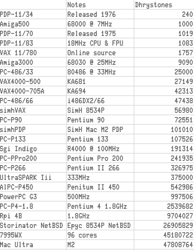 Бенчмарк Dhrystone 2.2 был выбран для тестирования по причине его совместимости со всеми протестированными системами. Этот тест основан исключительно на простых математических операциях, в случае векторизованного кода прирост производительности мог бы быть ещё более заметным. Все результаты Пламмер свёл в единую таблицу, в которой PDP-11/34 набрал 240 баллов, а «победитель» Mac Pro на M2 Ultra — 47 808 764 балла.